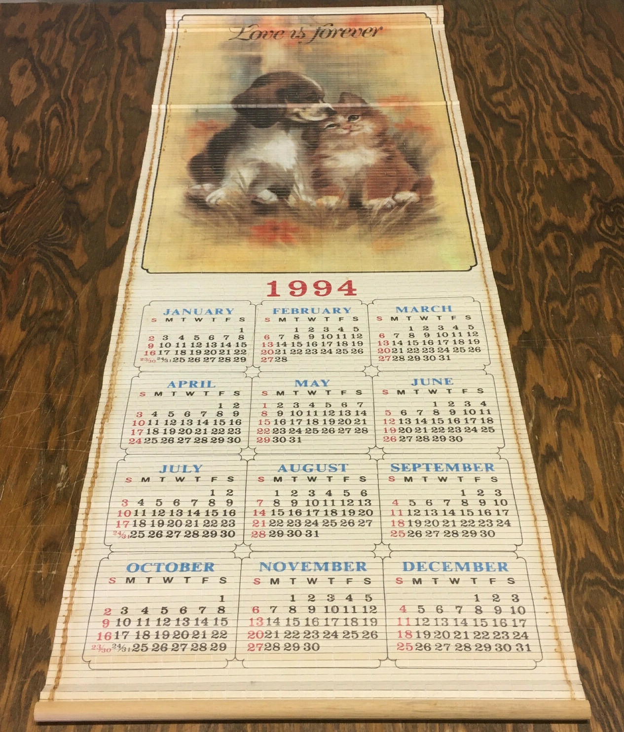 Vintage bamboo scroll 1994 calendar love is forever puppy kitten graphics