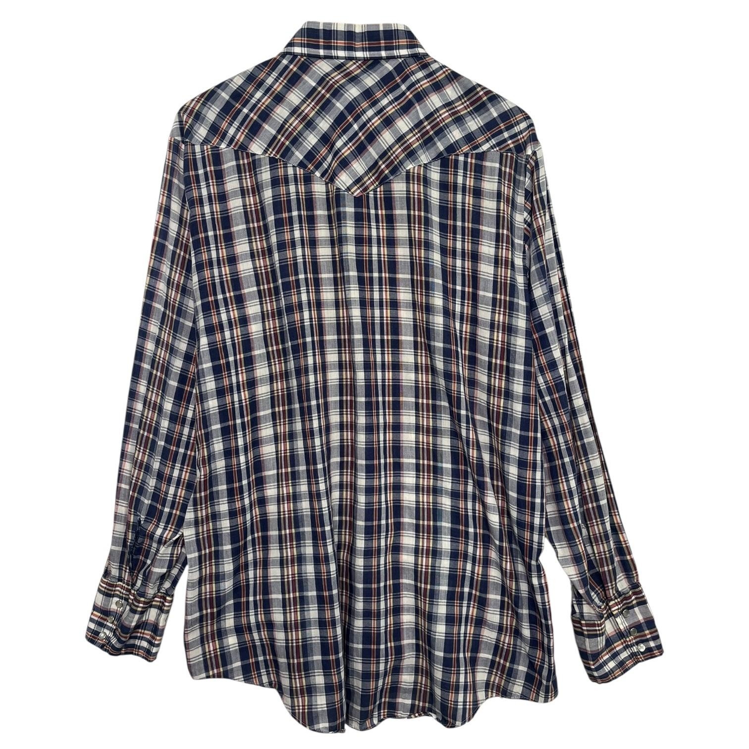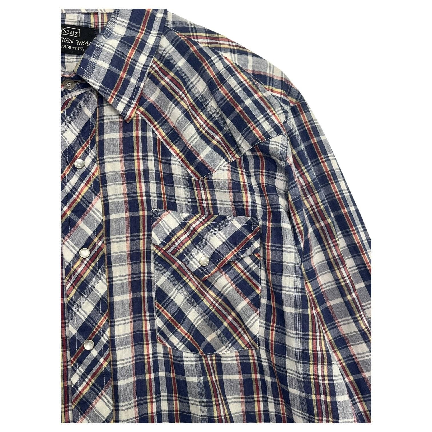 Vintage Sears Western Wear Shirt Mens XL Blue Red Plaid Pearl Snap Cowboy 70s