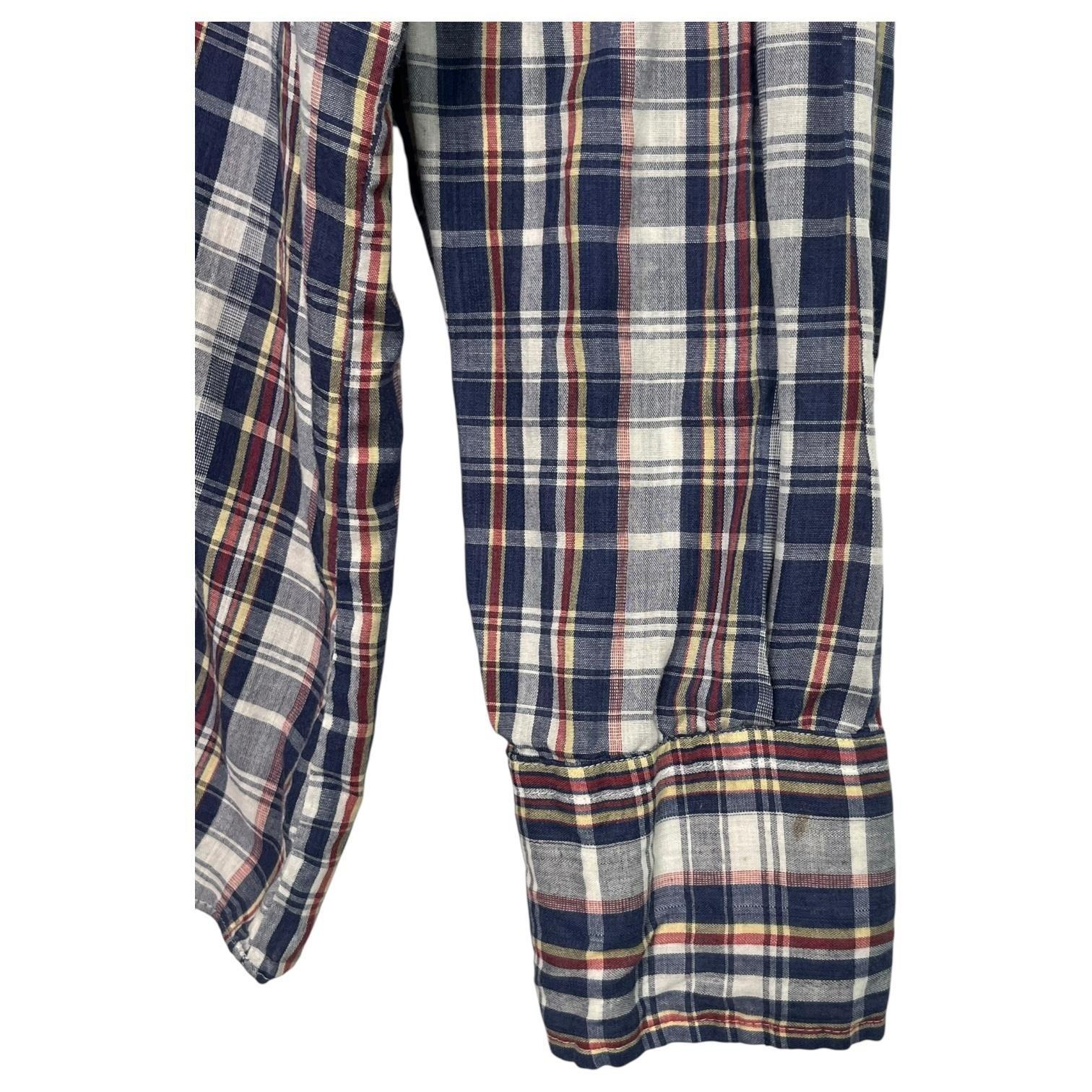 Classic Western pearl snap front closure with two snap chest pockets. Large western-style yoke front and back. Features a bold blue, red, and cream plaid pattern.