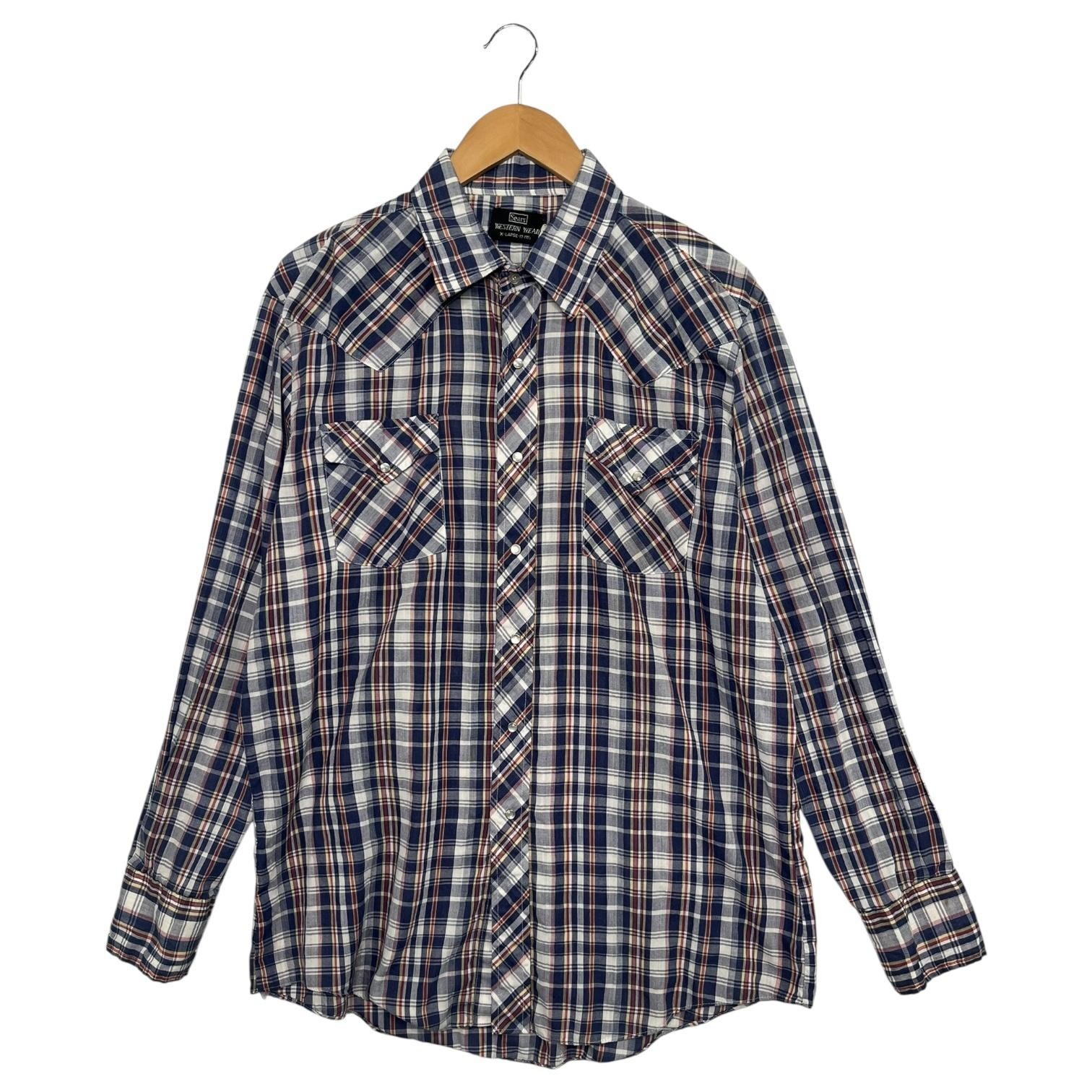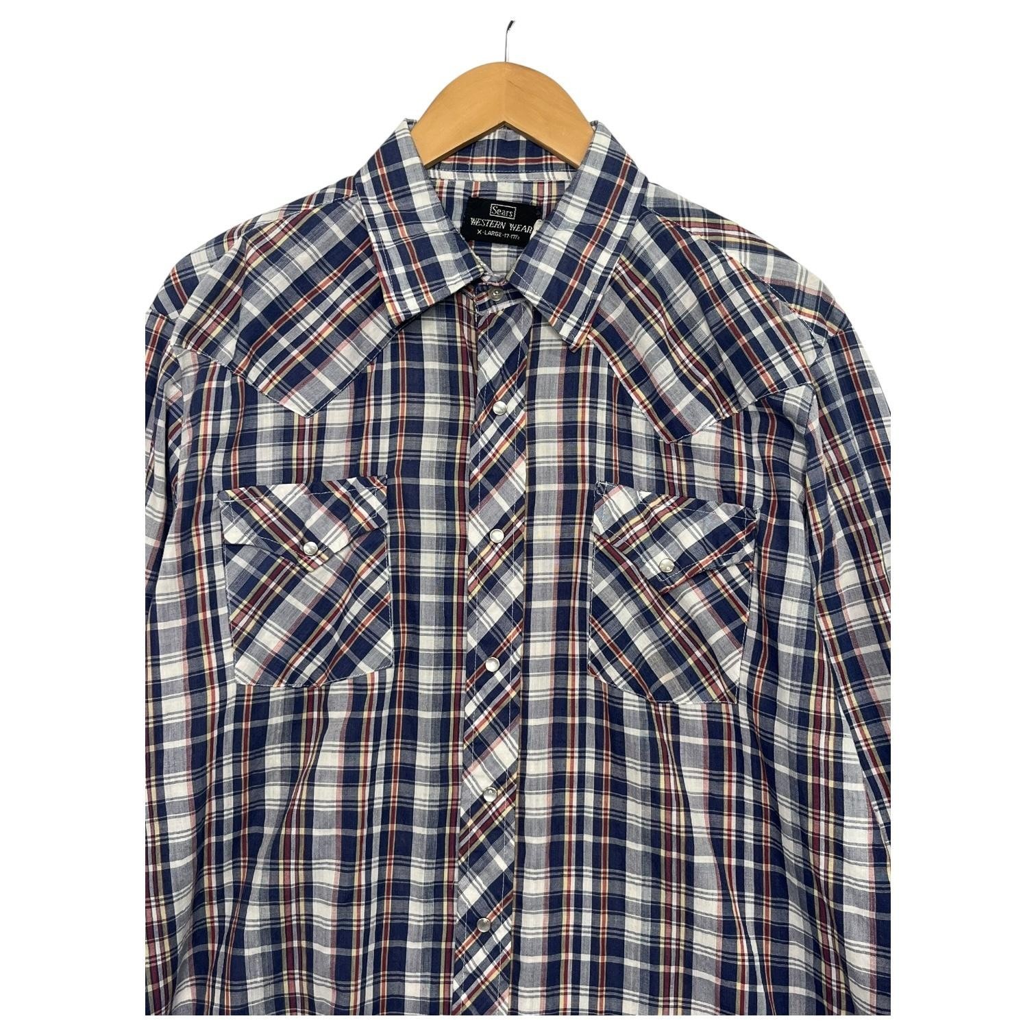 Vintage Sears Western Wear Shirt Mens XL Blue Plaid Pearl Snap Cowboy 70s Retro