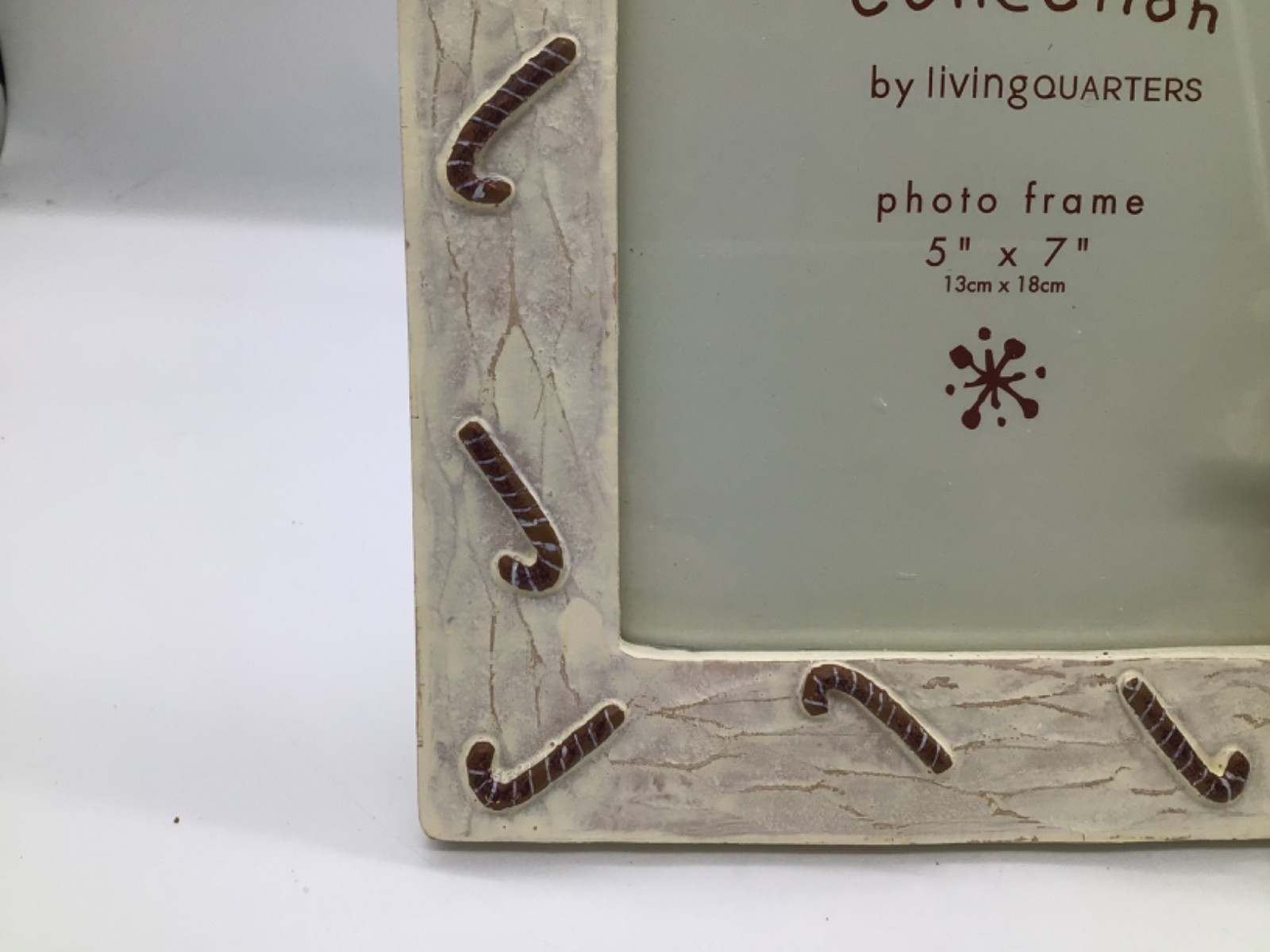 Add a touch of festive charm to your holiday decor with this Flurryville Collection "Chilly Claus" photo frame by LivingQuarters. Designed to hold a 5" x 7" photo, this decorative frame features a snowman Santa (Chilly Claus) with candy cane accents, perfect for displaying family holiday photos. Comes with its original box.