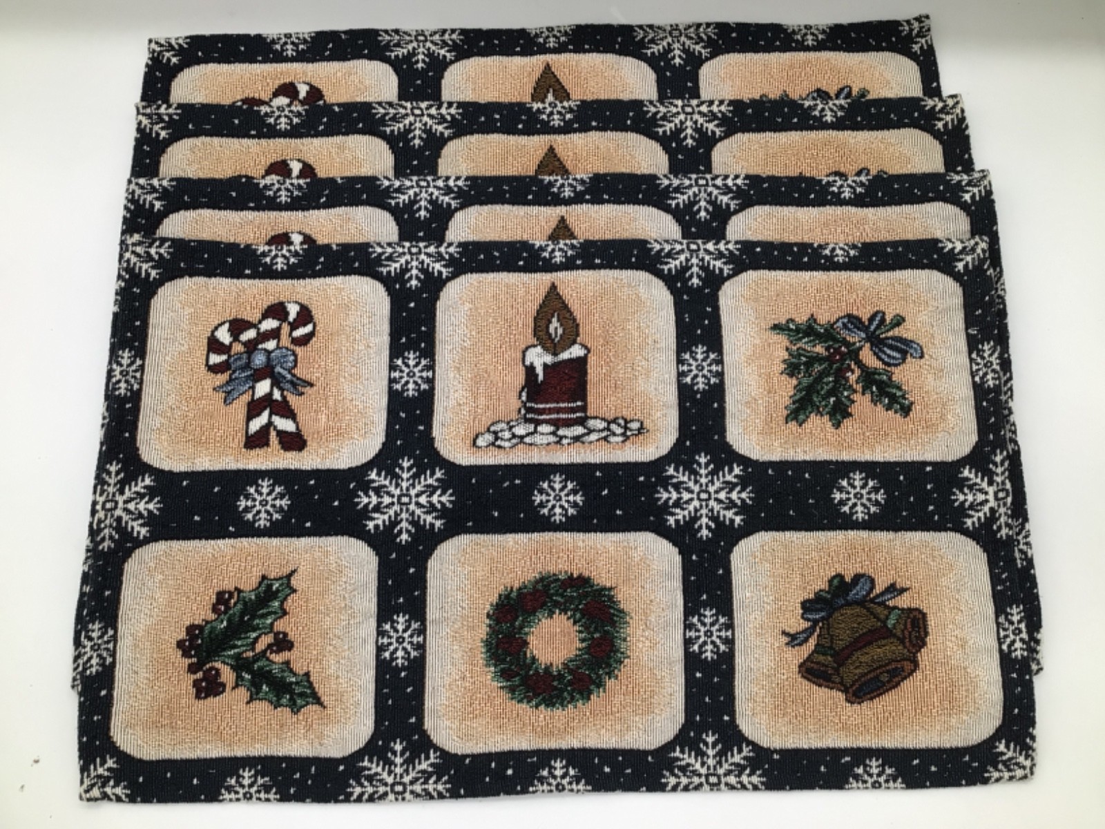 Add festive charm to your holiday dining with this set of 4 woven Christmas placemats. Featuring classic holiday motifs including a wreath, holly, bells, candy cane, candle, and greenery, all framed with snowflakes on a dark background. Perfect for Christmas dinners, holiday parties, or everyday seasonal decor.