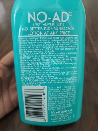 NO-AD SPF 30 Kids Sunscreen Sunblock Lotion Waterproof PABA-Free 16 oz  added to cart.