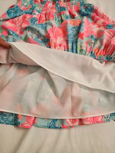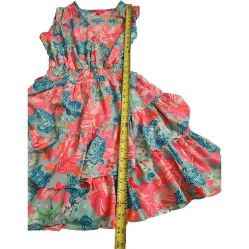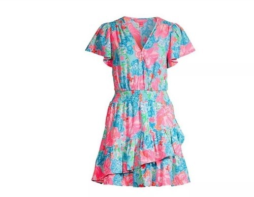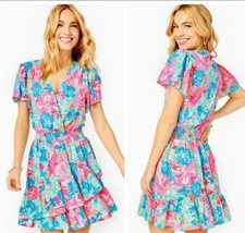 DETAILS: New with tags, Lilly Pulitzer fit flare dress. Maryanne stretch style. Surf blue, multicolor ?luscious lions? floral print. Woven, lileeze fabric. Short flutter Sleeve. V-neck, surplice. Faux wrap bodice. Smocked waist. Asymmetric Ruffled tier skirt. Pullover head to wear. Excellent dress for resort, party, date night, workwear, casual or any occasion.