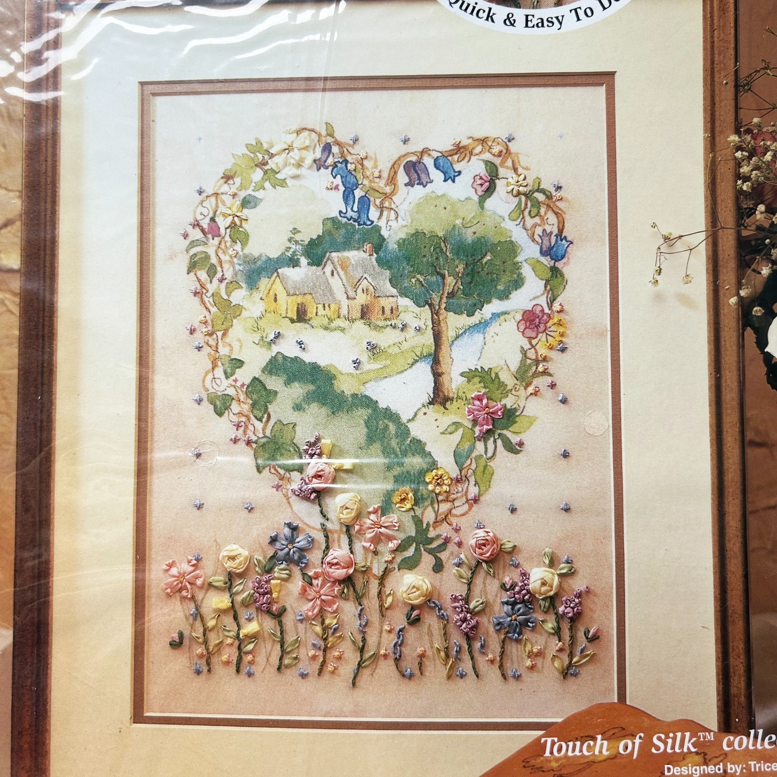 Bucilla Silk RIbbon Embroidery Kit Heart Cottage Flowers Quick & Easy 9" x 12"