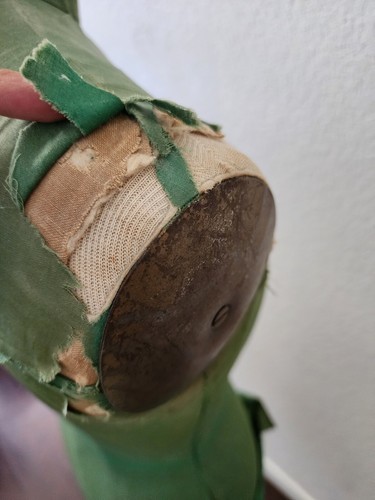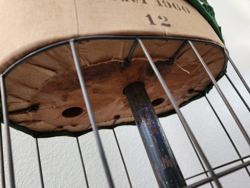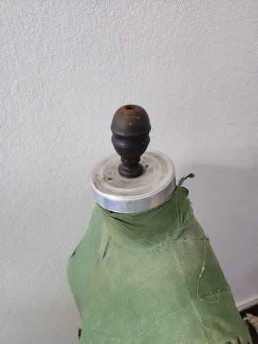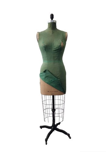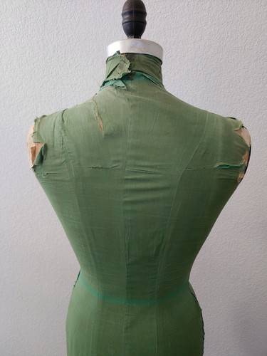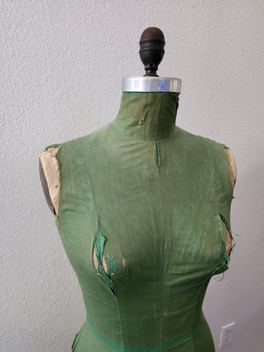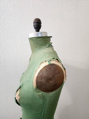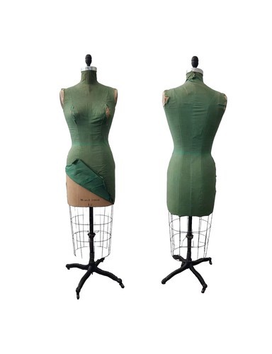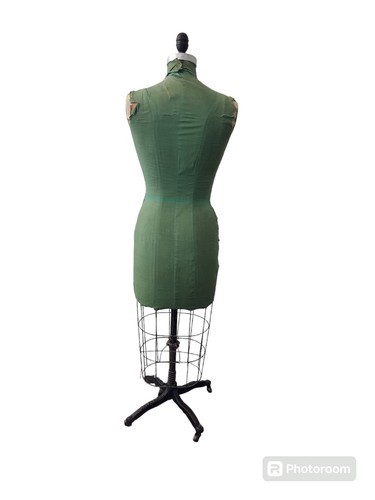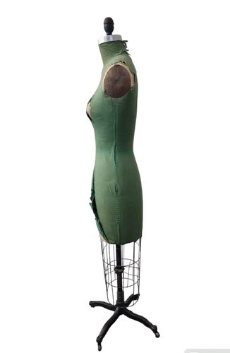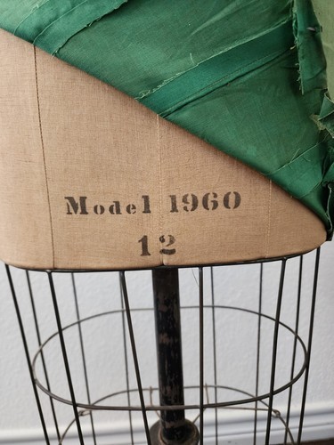Dress Form has a cast iron base. Possible been collapsible but missing a pedal(?) See last photos. Wheeled. Turns well. Covered in custome green fabric. Under the fabric is beige tone orogonal Dress Form cover marked 1960 #12. Left chest is slightly dented.