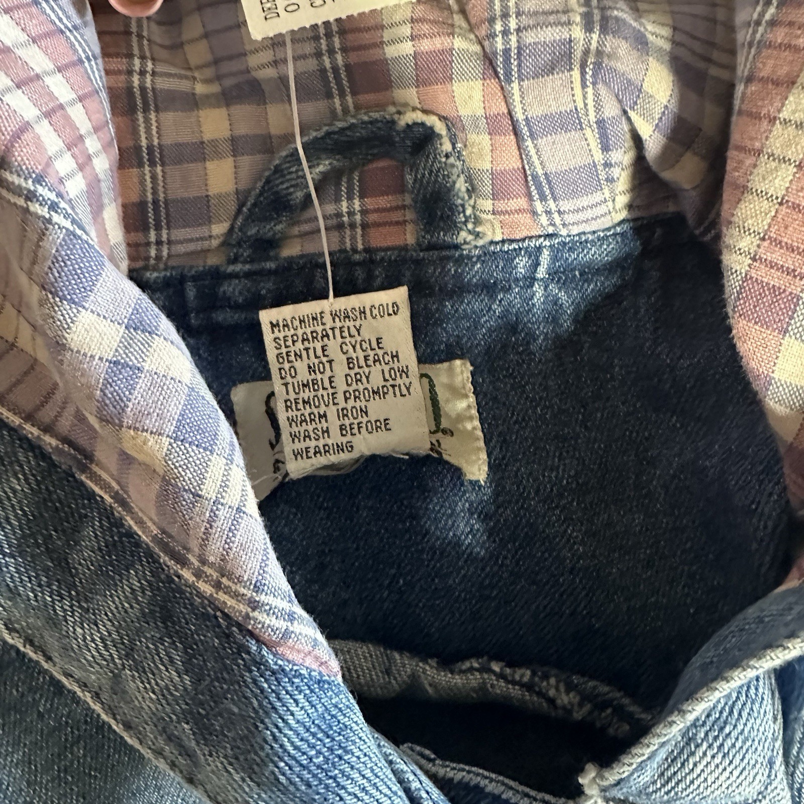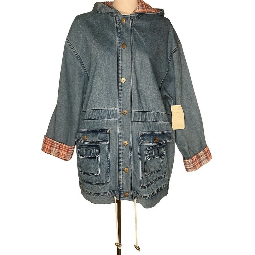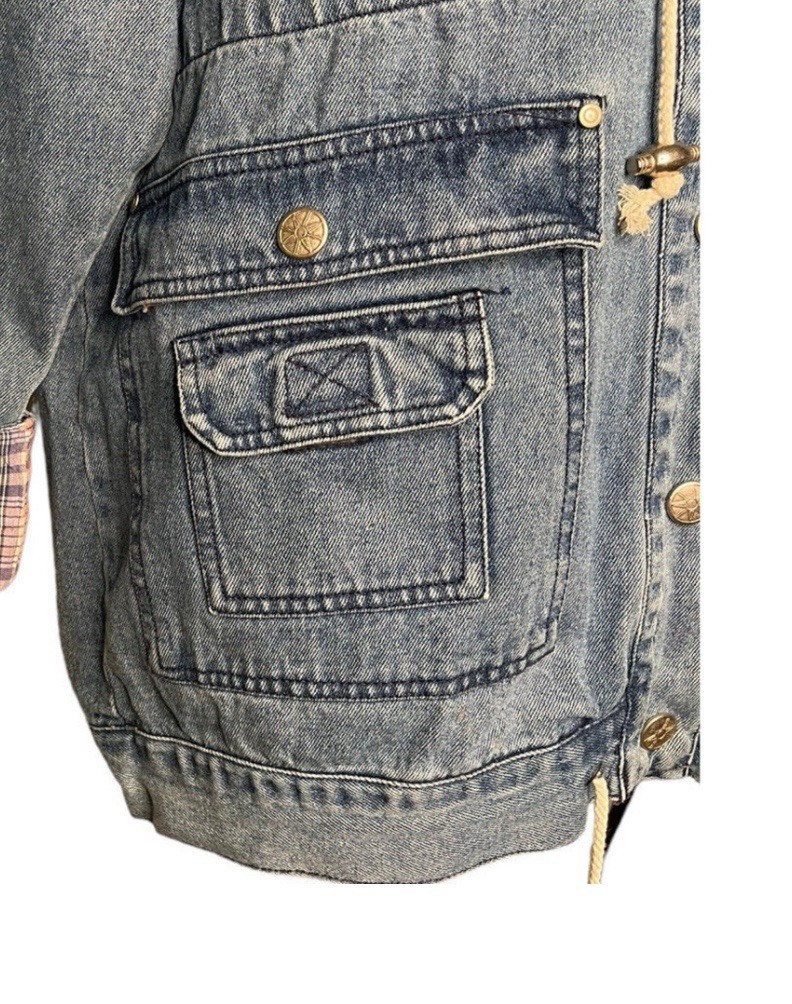 Vintage Stefano Women's 90's Oversize Denim Barn Jean Jacket with Plaid Trim, Hood and Drawstring Waist- New with Tags!