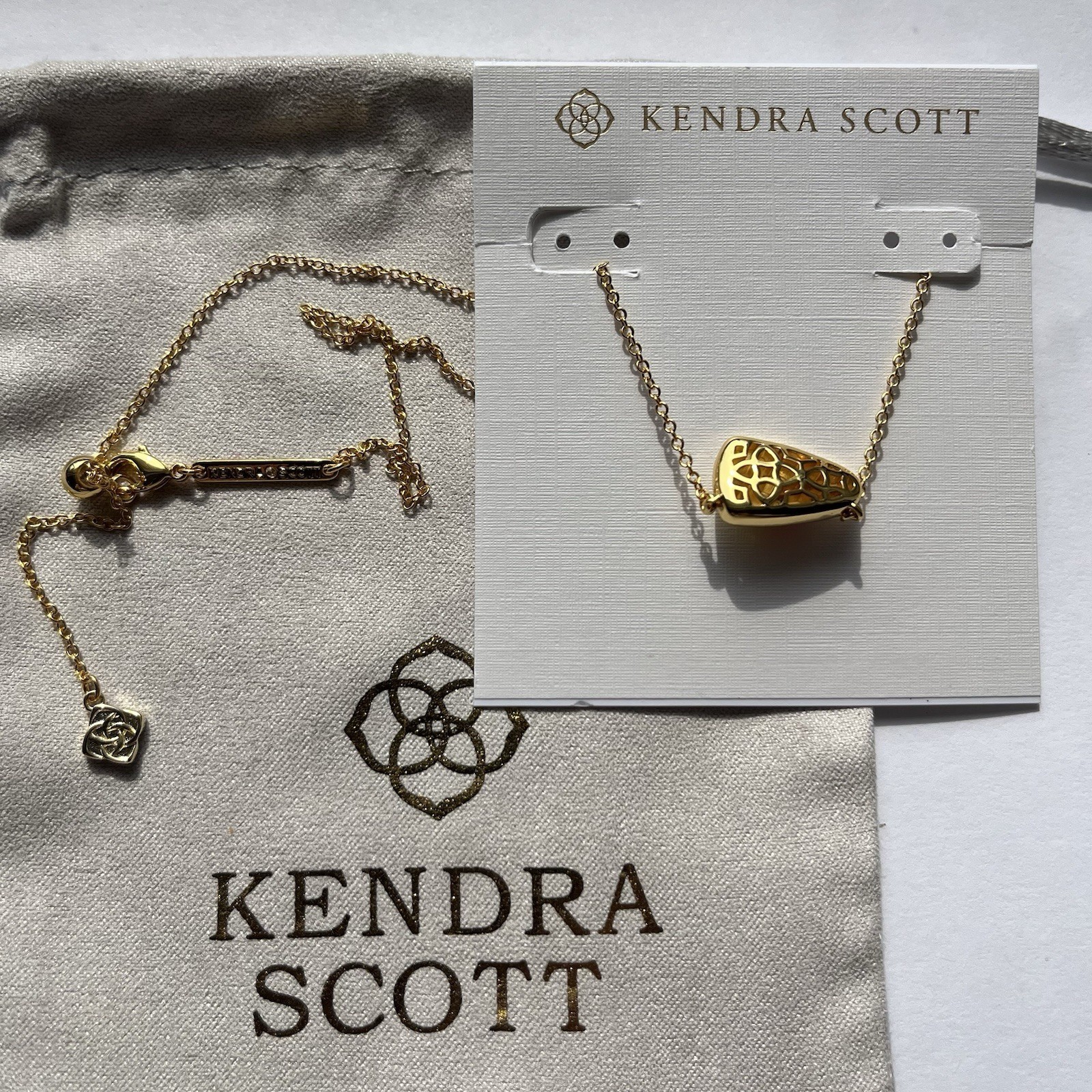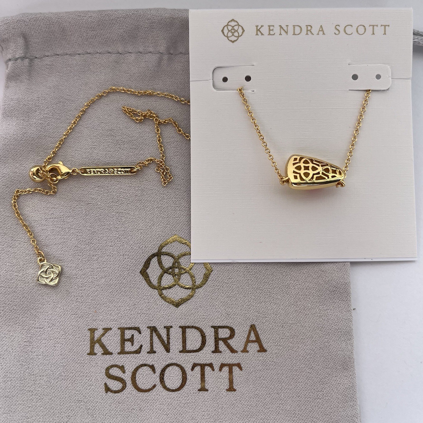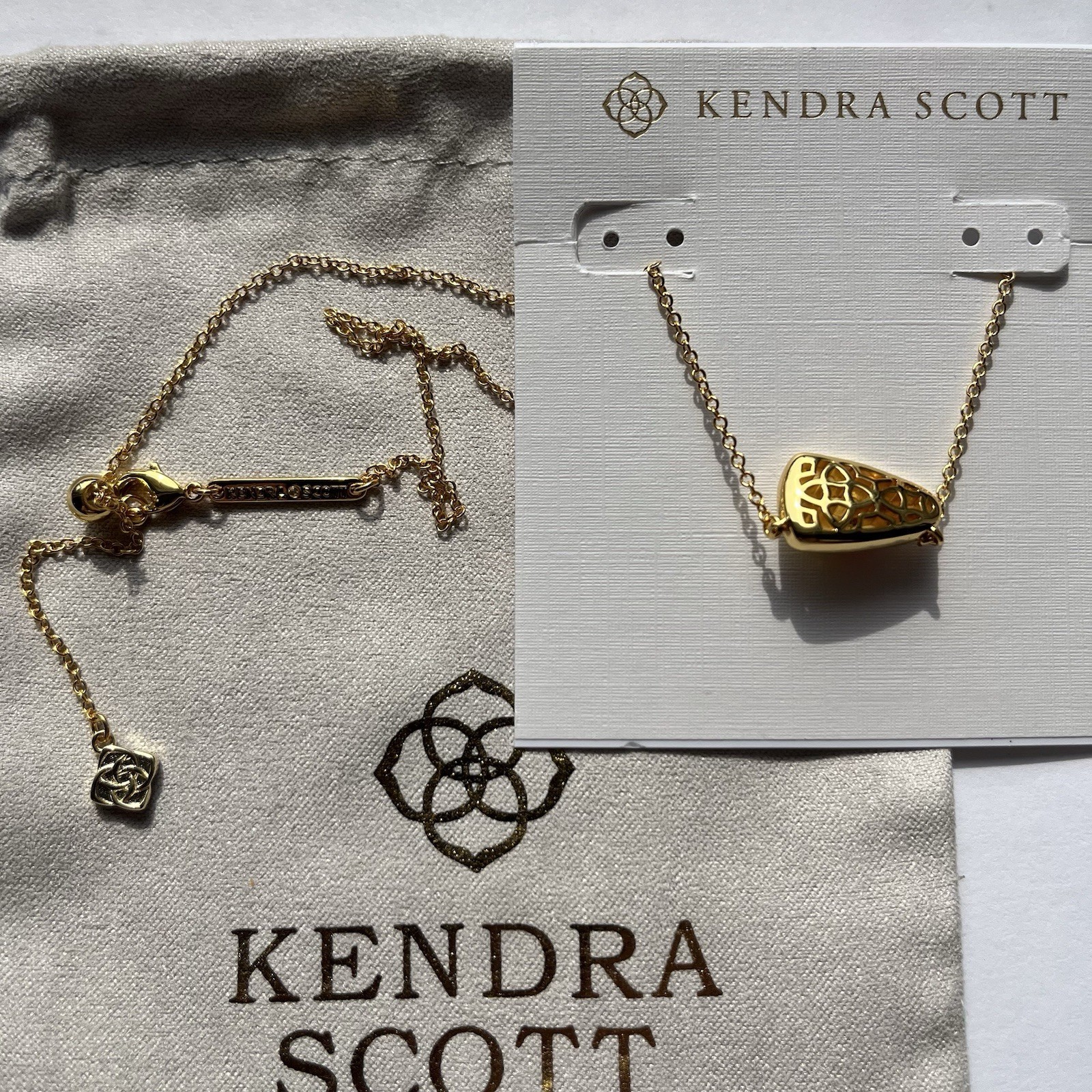 Gold plated over brass. Kendra Scott pouch included. Size: 18? L , Each one has its own unique color and pattern may very slightly.