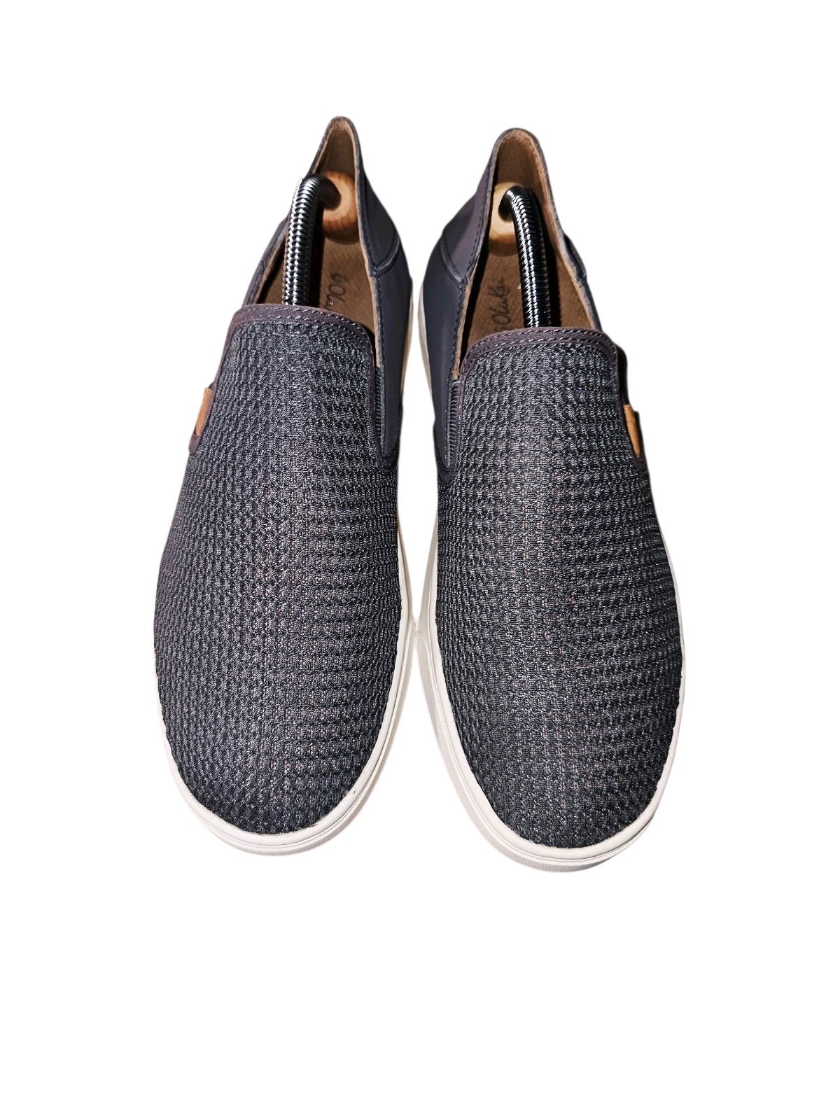 The product is a pair of women's Olukai Pehuea gray slip-on sneakers in size 9.5 US (8 UK). These casual and comfortable shoes feature a round toe, solid gray color, and a synthetic upper material with a fabric lining. They are designed for outdoor activities, suitable for travel, workwear, and business occasions. The shoes have a cushioned foam insole, breathable fabric lining, and a rubber outsole for added comfort and durability. Perfect for the summer, fall, and spring seasons, these sneakers are a stylish and practical option for everyday wear.