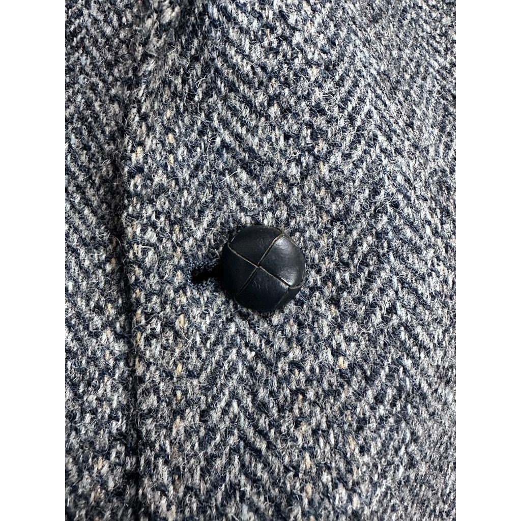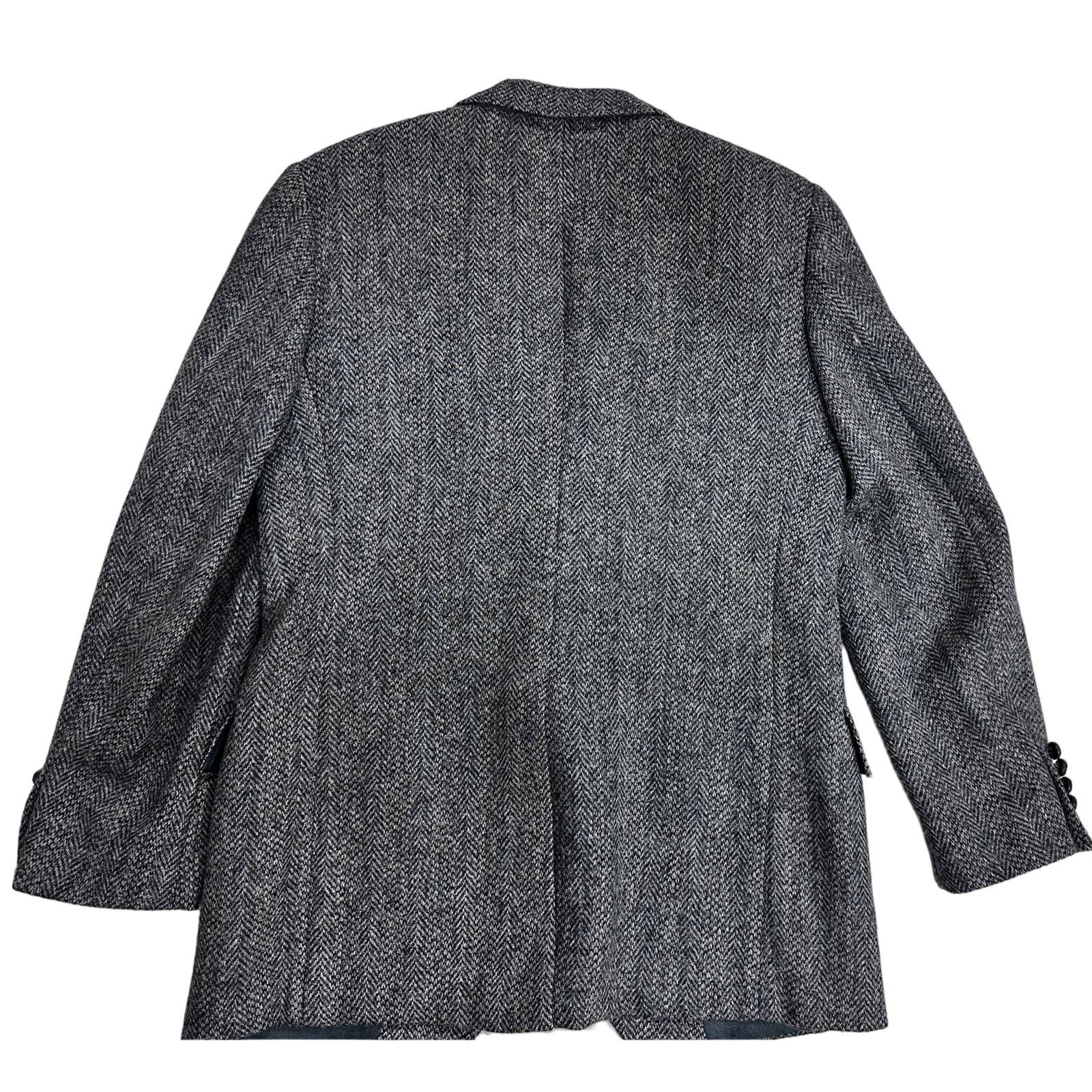 Vintage Kuppenheimer Harris Tweed sport jacket, handwoven in Scotland of 100% pure wool. Blue-grey tweed with leather buttons, classic notched collar, and structured tailoring. Still retains its original paper inspection tag. Estimated size 42, based on matching jacket from same estate.