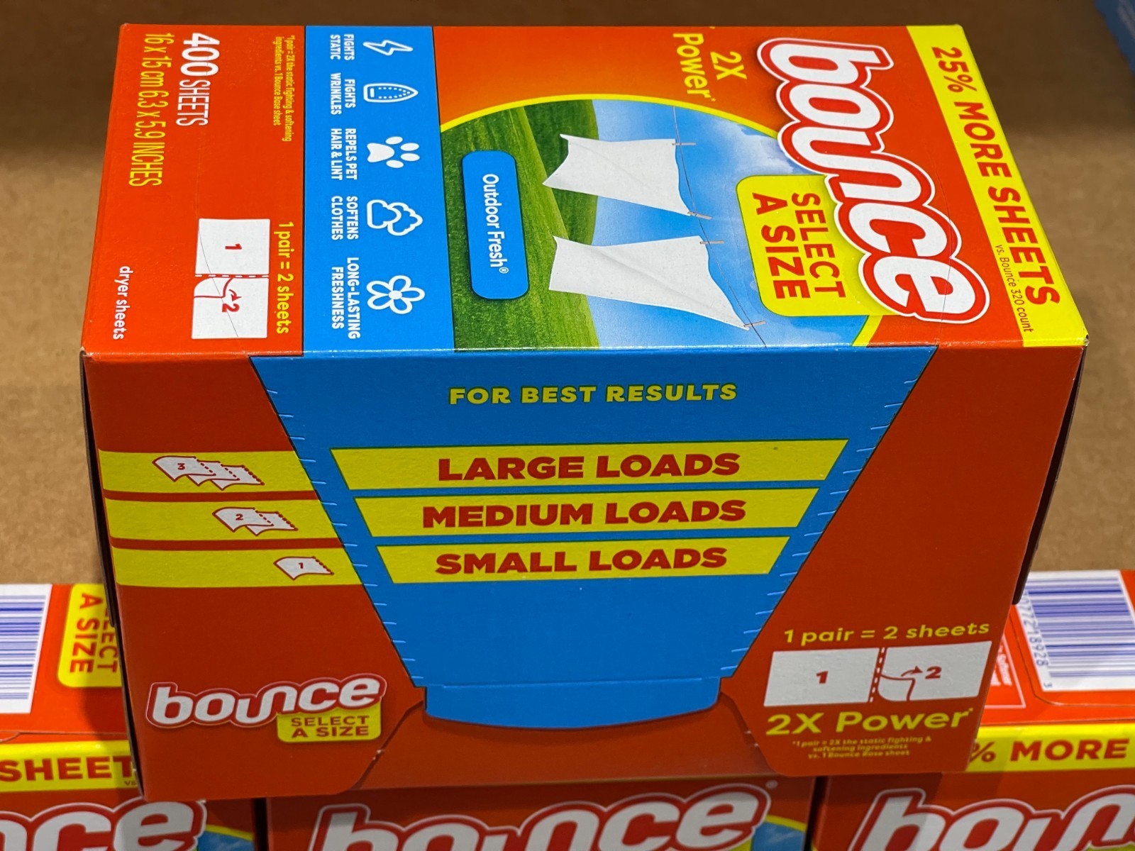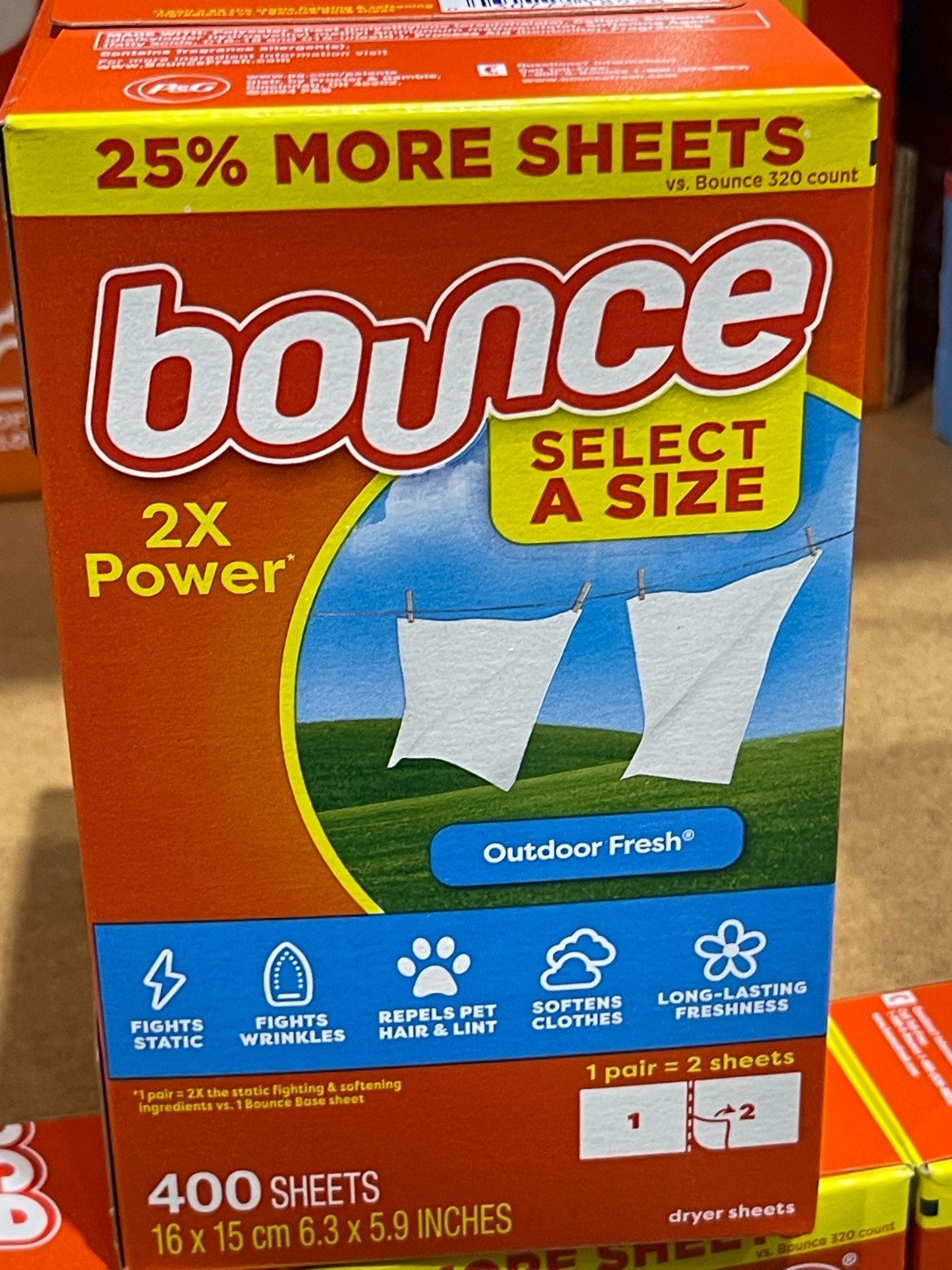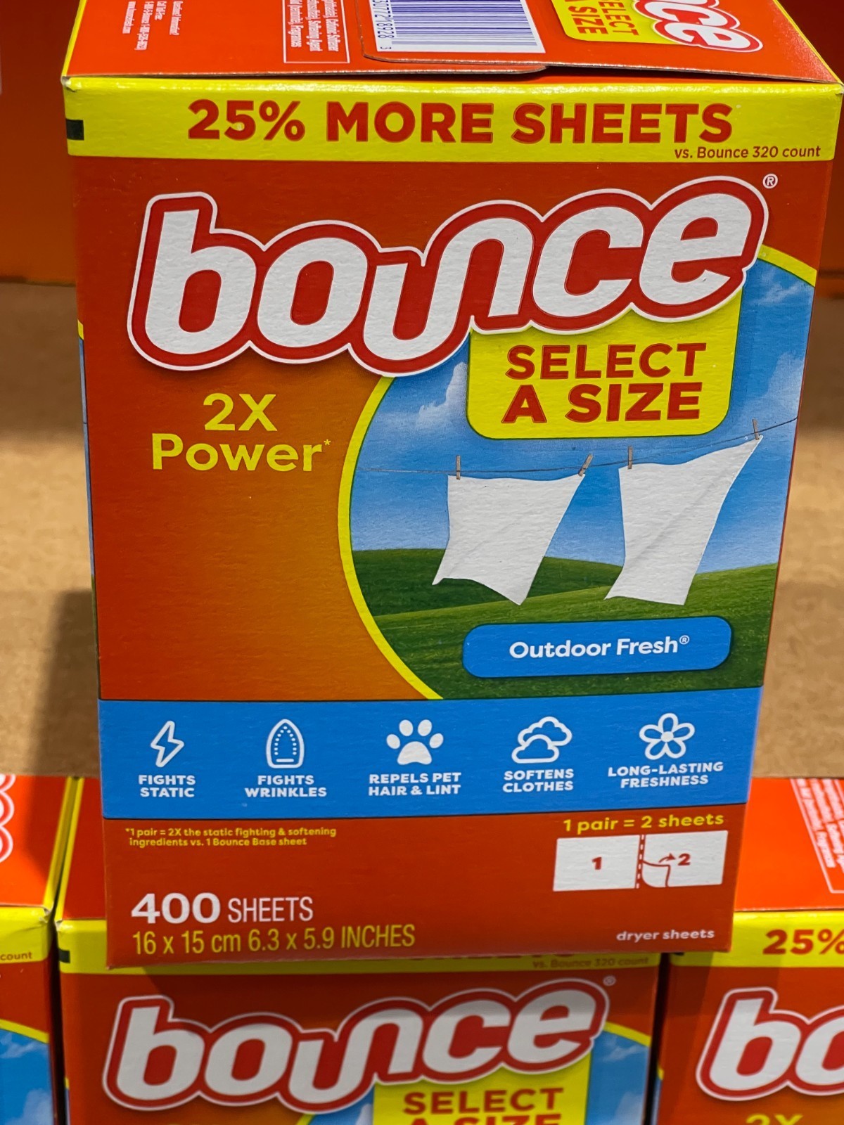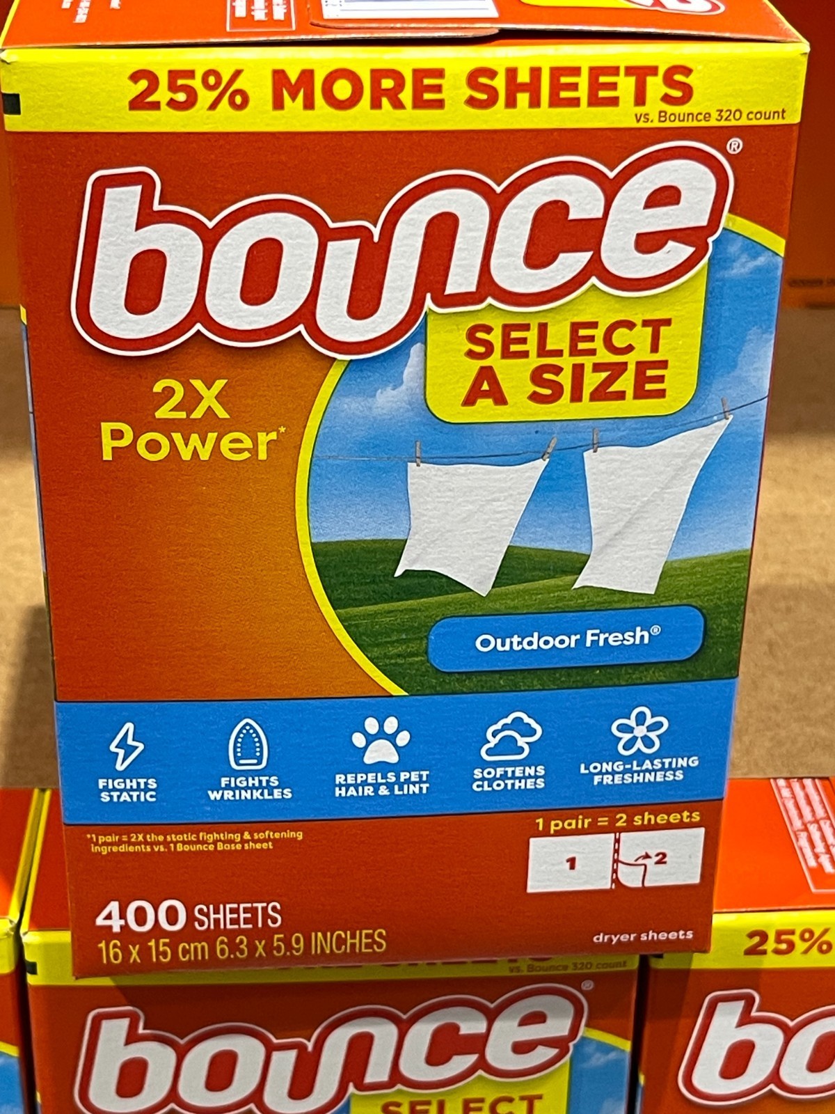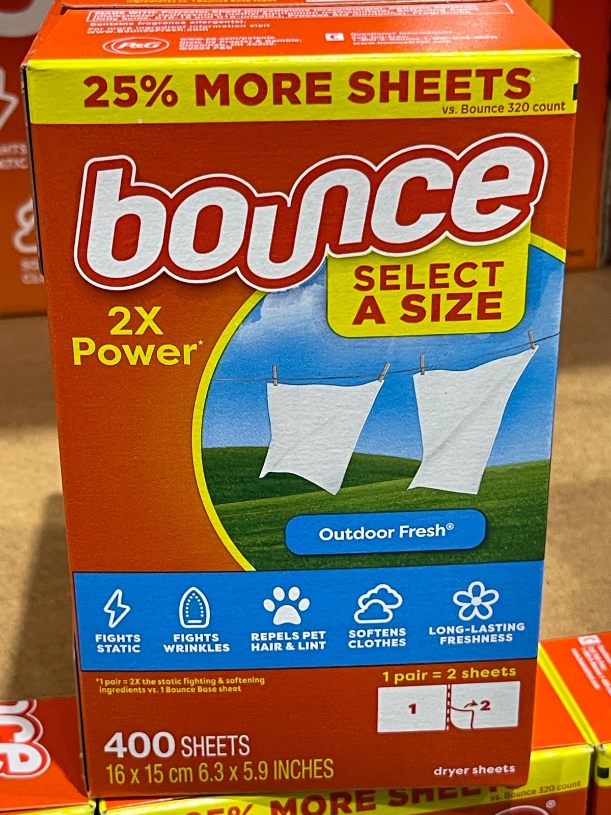 Try Bounce Outdoor Fresh Select a Size Dryer Sheets, which allow you to select your size of sheet for different-sized loads. Each pair of Bounce Outdoor Fresh Select a Size Dryer Sheets is perforated so you can customize to use just what you need, whether less for smaller loads or more for larger loads. Toss in two Bounce Outdoor Fresh Select a Size Dryer Sheets for your average loads to iron less, fight more static, and add more softness. One will do for small loads, and if you're catching up on laundry and have an extra-large load, toss in three! A Must Have for Every Laundry Routine: Bounce Dryer Sheets make clean laundry smell fantastic, reduce wrinkles and static-cling, and stay fresh for days. You can also use Bounce Outdoor Fresh Select a Size Dryer Sheets around the house. Tuck them in drawers or closets, put them in gym bags and suitcases, or stash them at the bottom of your trashcan to bring that Bounce Outdoor Fresh scent you know and love out of the dryer and into your home.