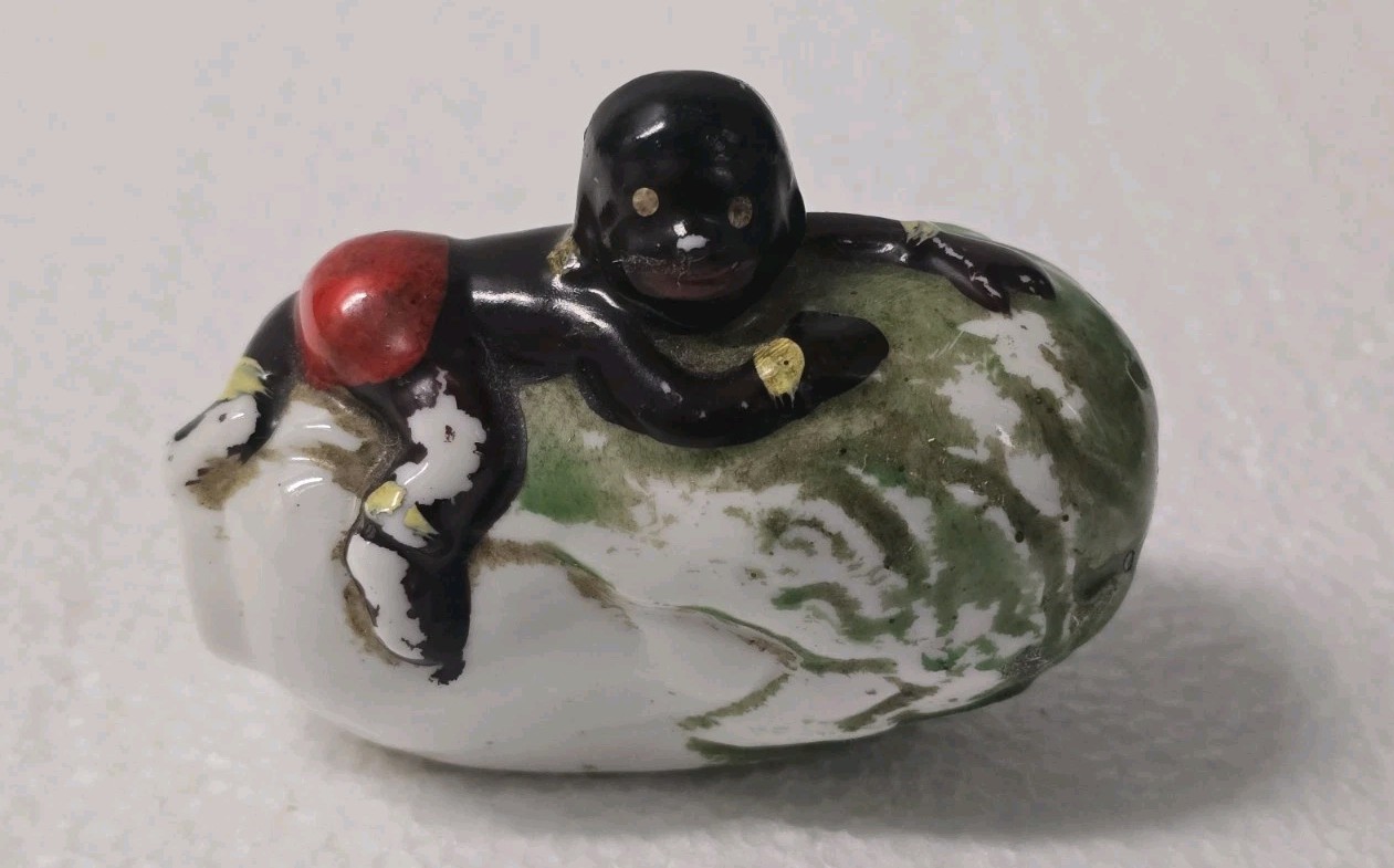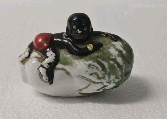 This vintage ceramic salt/ pepper item features a novelty design with a black Americana memorabilia theme of a African American child on top of a head of cabbage and it includes a cork stopper. The multicolor shakers are crafted from ceramic and are original pieces from the 1950s. This is is a single item it is not a complete set, it's only 1 salt/pepper shaker as displayed in the photo gallery.