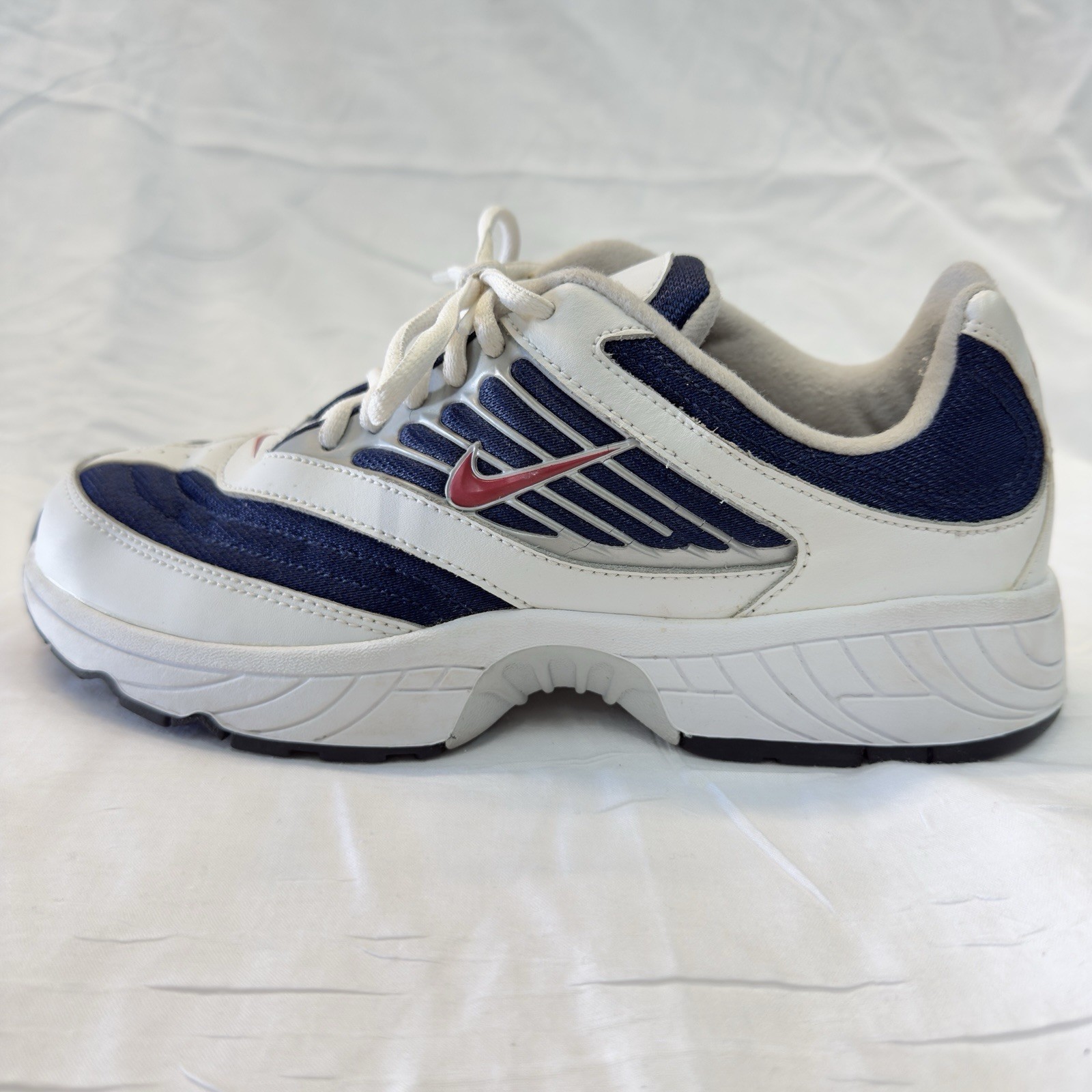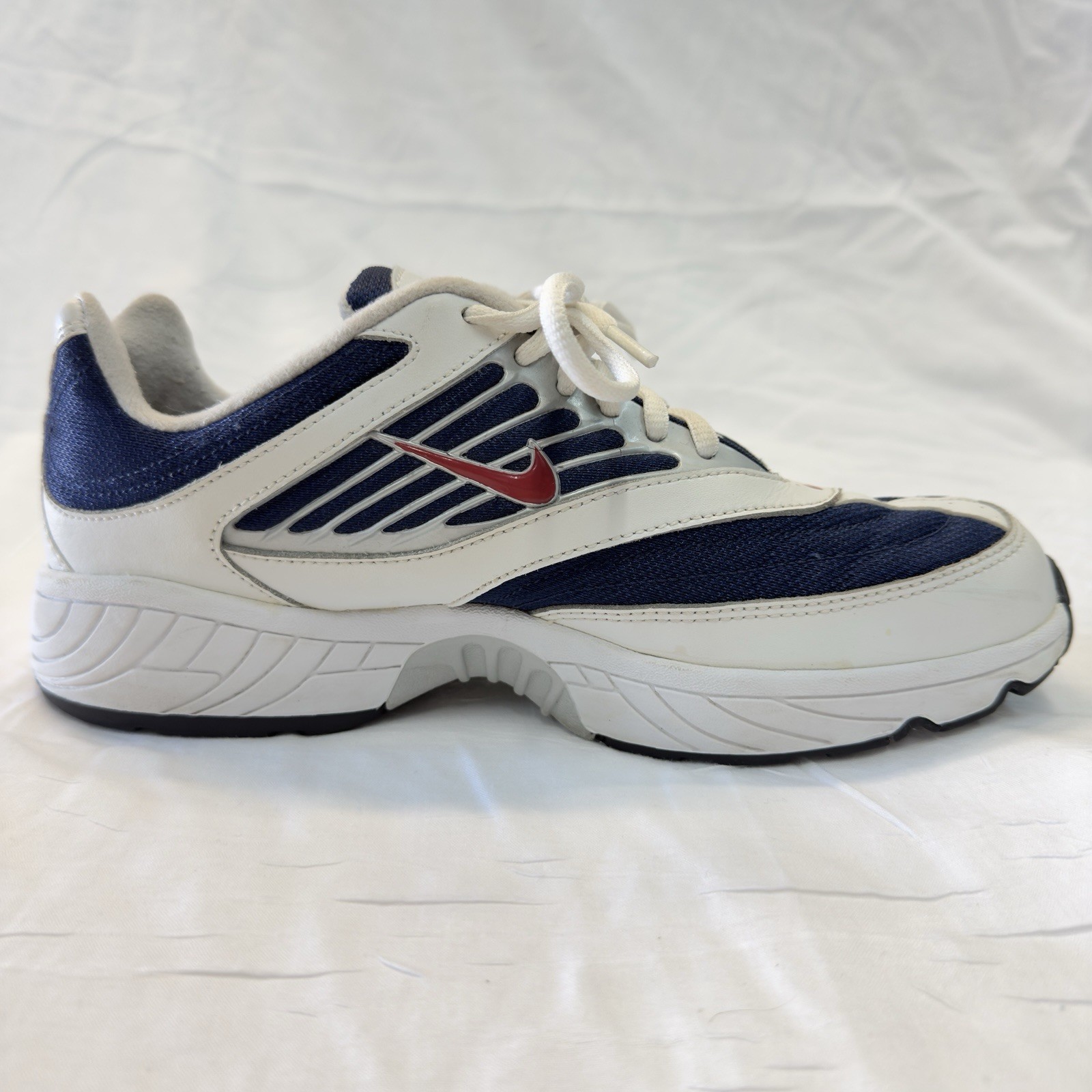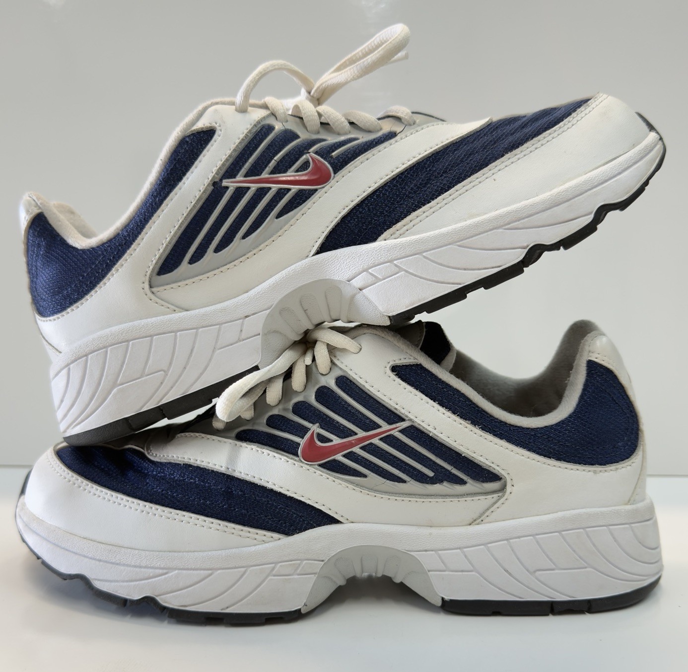 Step into retro style and comfort with this rare pair of Nike Air Zoom Citizen sneakers, released in 2007. This classic runner features a sleek white leather and navy mesh upper, accented by varsity red Swoosh logos. A true piece of Nike history, perfect for collectors or anyone who loves vintage Y2K sneakers.