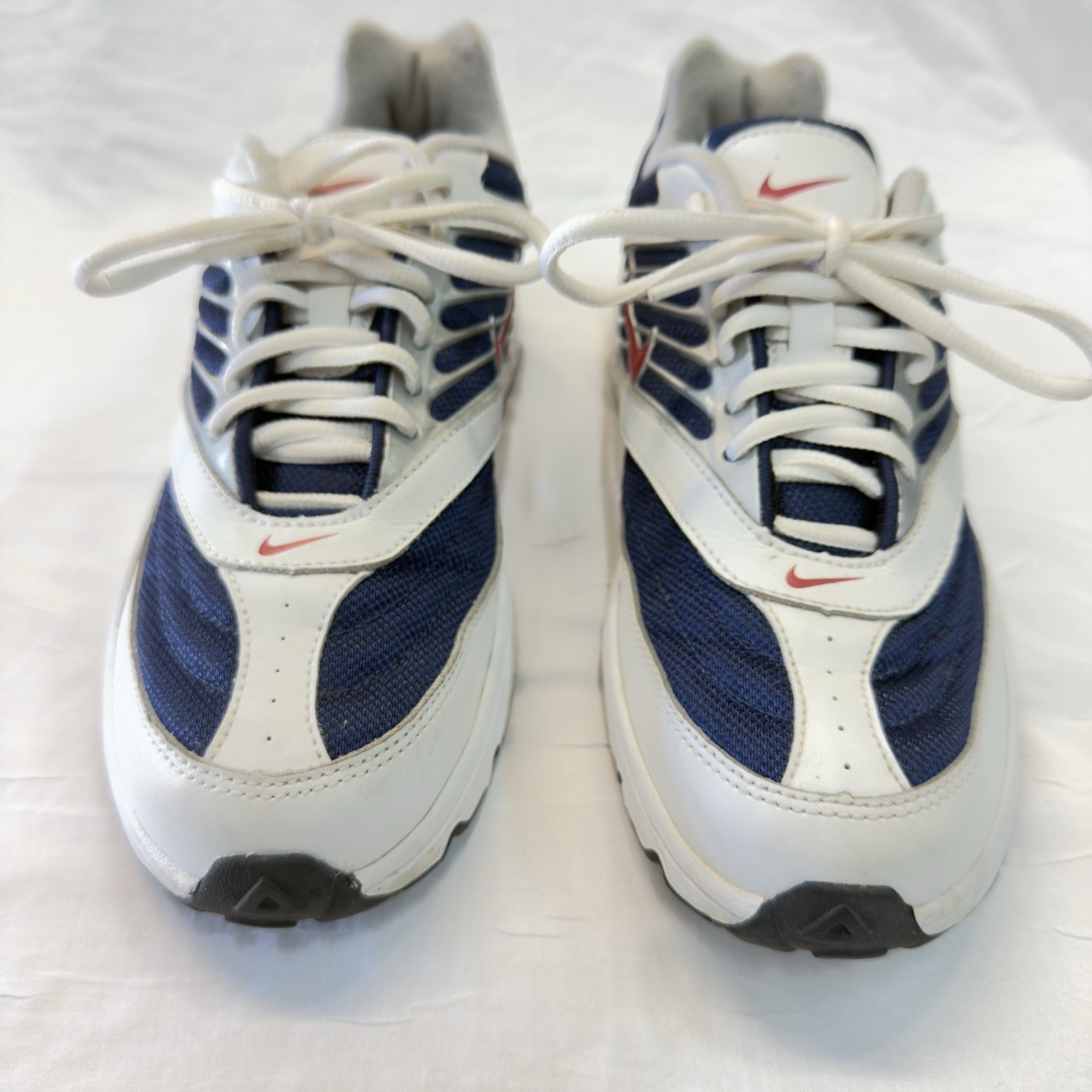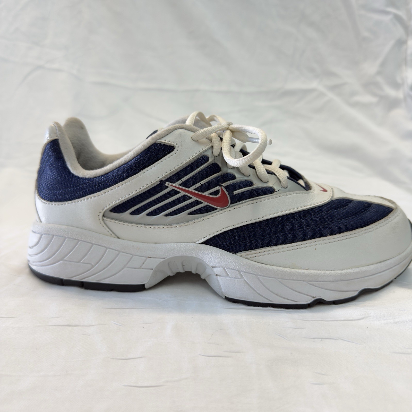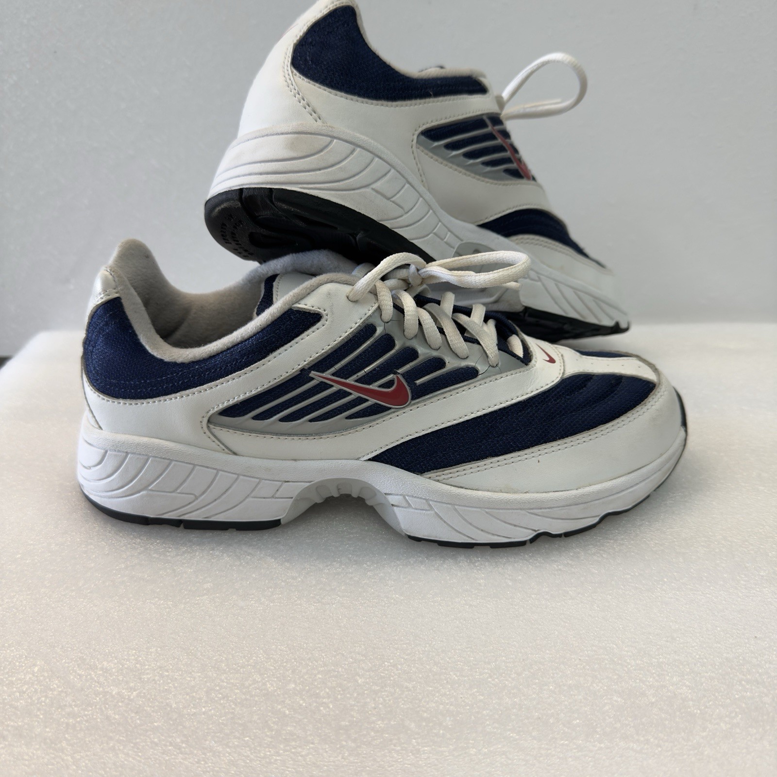Step into retro style and comfort with this rare pair of Nike Air Zoom Citizen sneakers, released in 2007. This classic runner features a sleek white leather and navy mesh upper, accented by varsity red Swoosh logos. A true piece of Nike history, perfect for collectors or anyone who loves vintage Y2K sneakers.