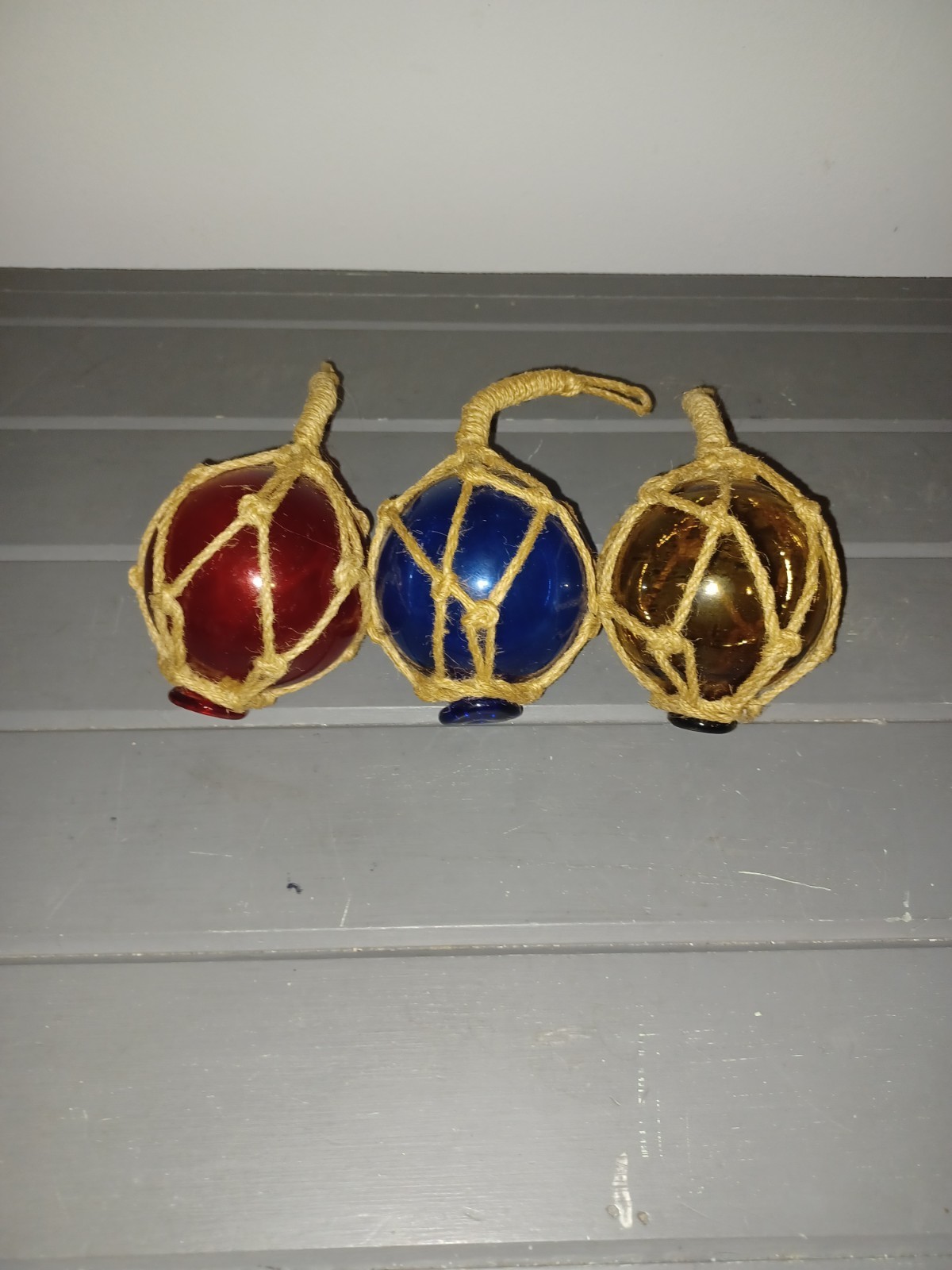 Glass Fishing Net Ball Float Japanese Buoy 3 Blown Glass Orbs Blue Red Amber 4"