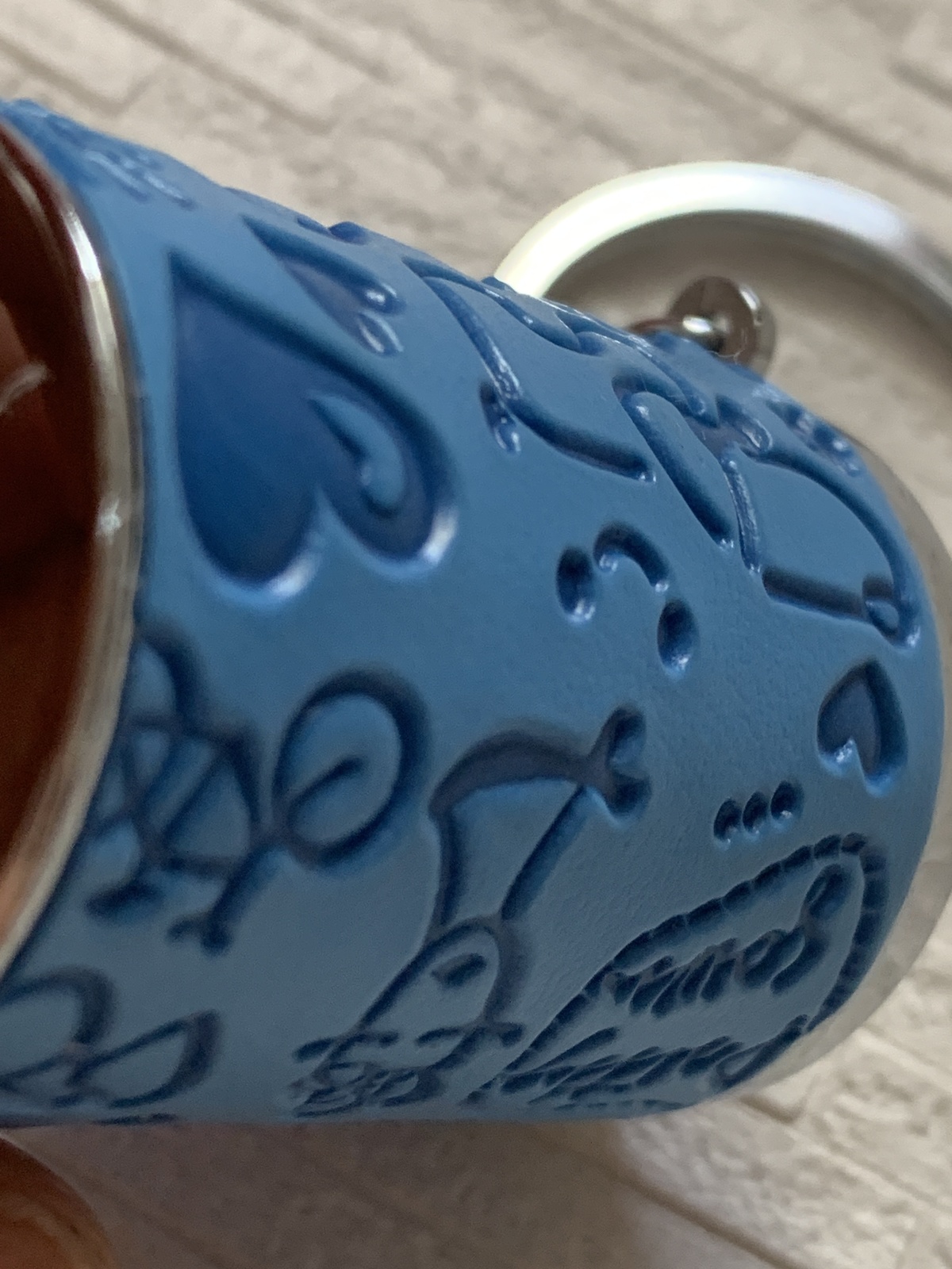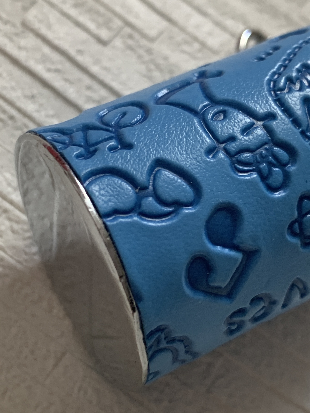 Fancy design coin case keychain, blue fancy coin case. This convenient keychain allows you to insert and remove coins by pressing the button on top. The coins are approximately 2.3 cm in size. They should hold about 10 coins. They are 4.5 cm tall. They are in good condition.