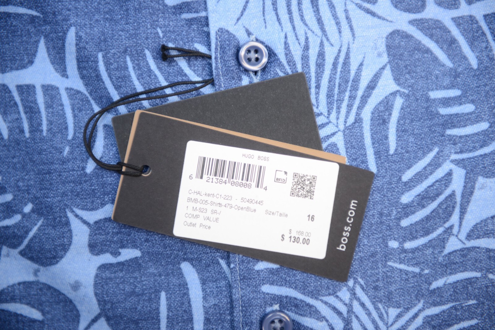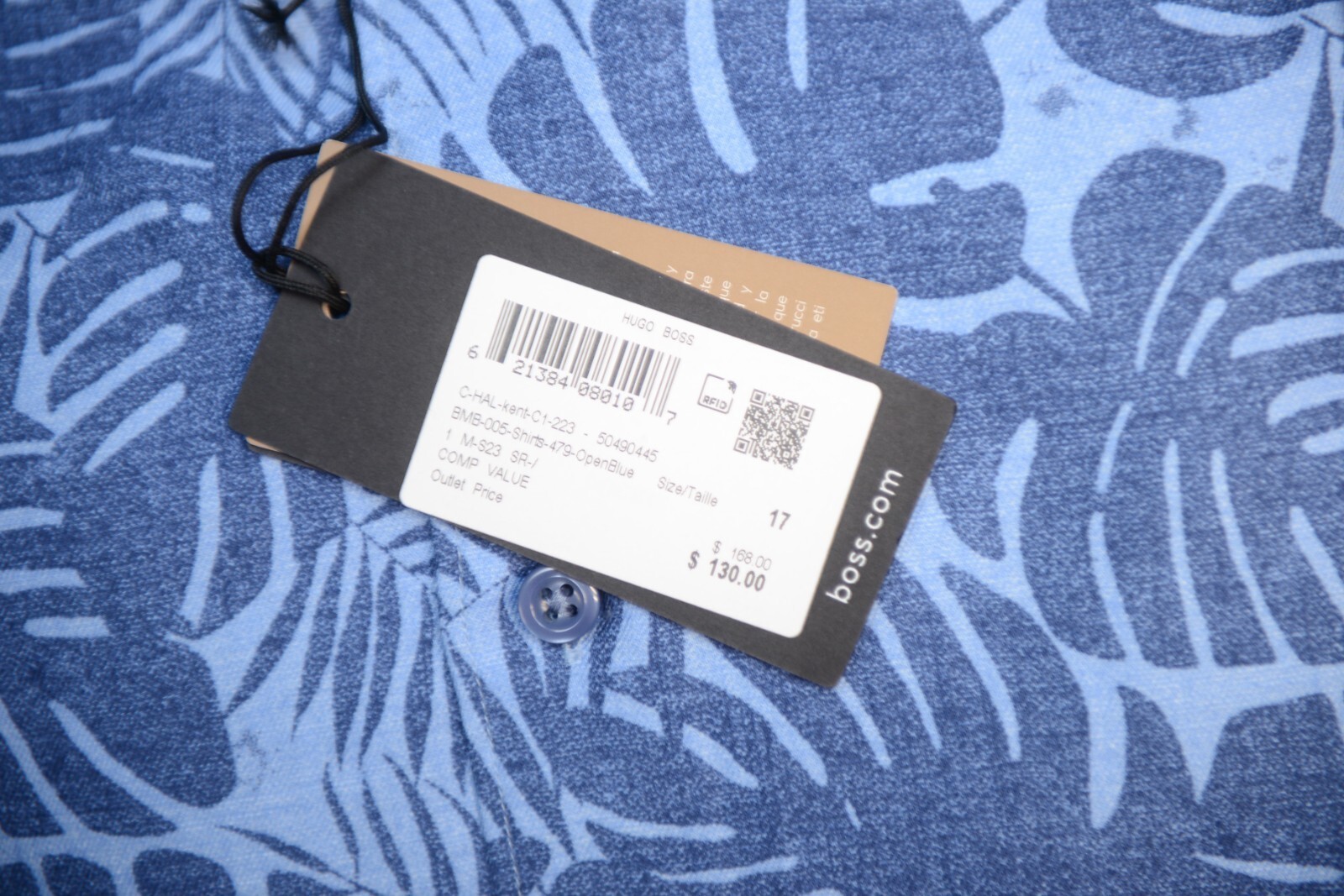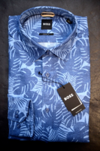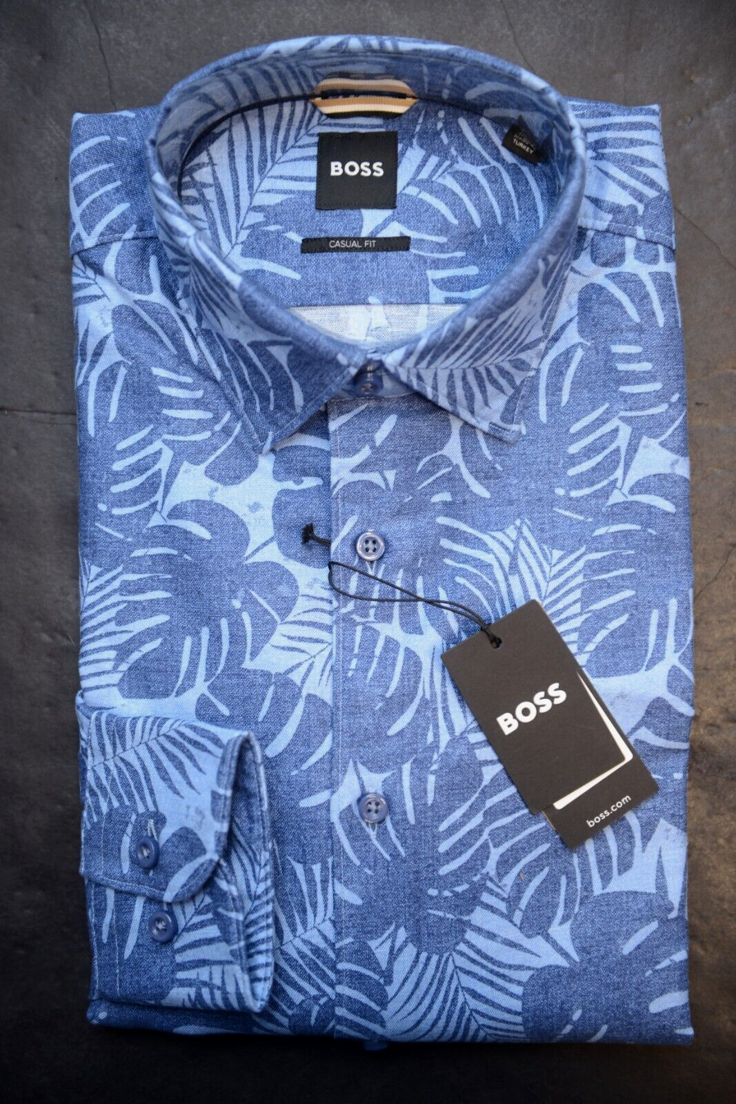NWT Hugo Boss Herren Hal Kent Casual Fit Blue Blattbaus Baumwolle/Leinenhemd Hemd