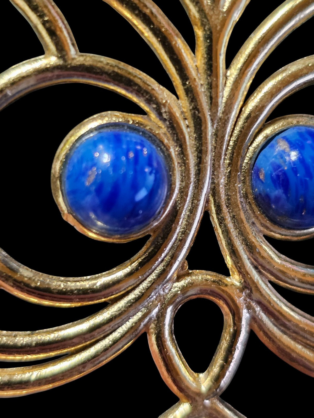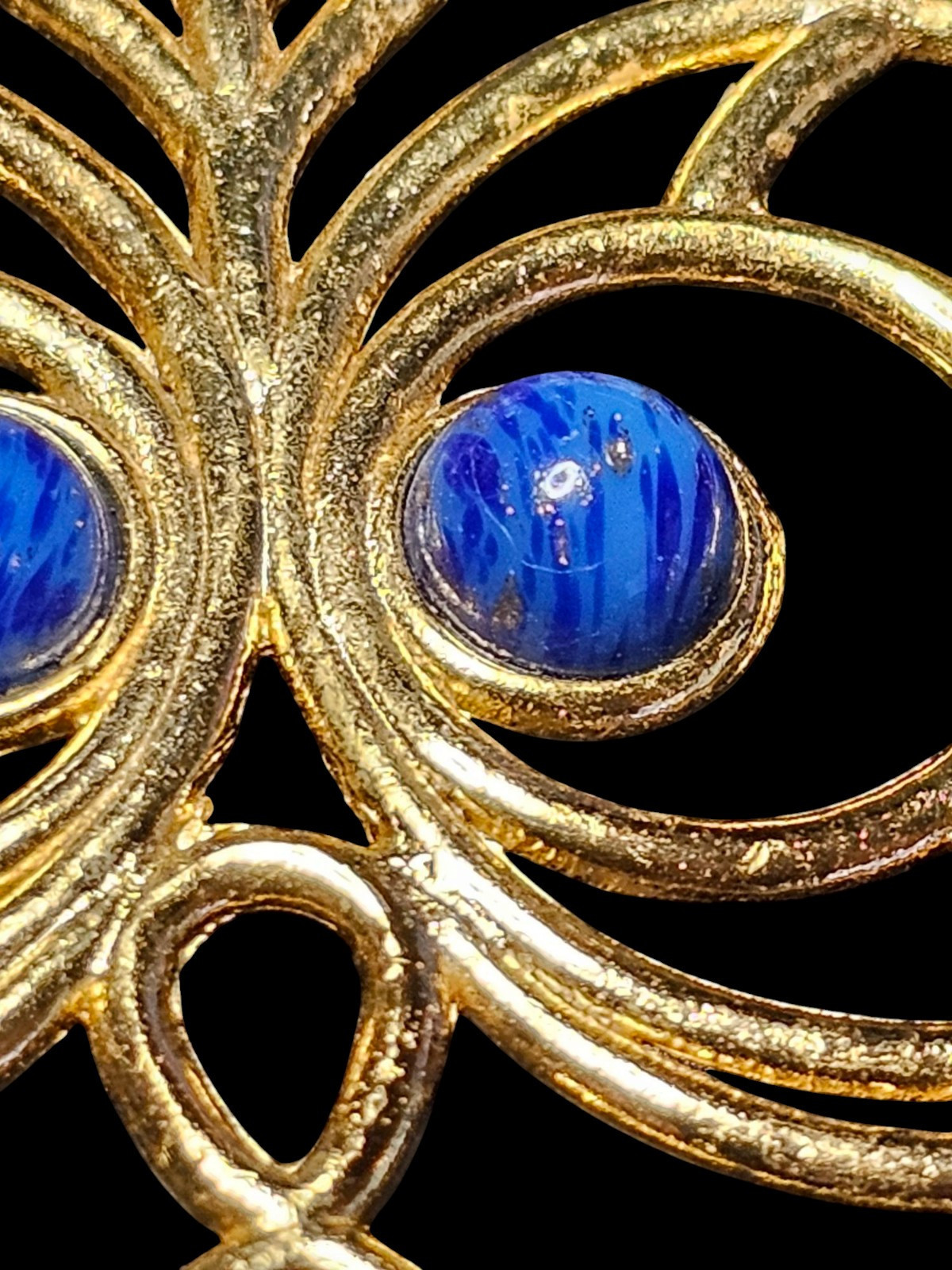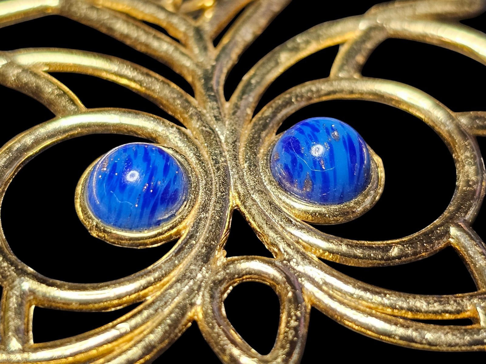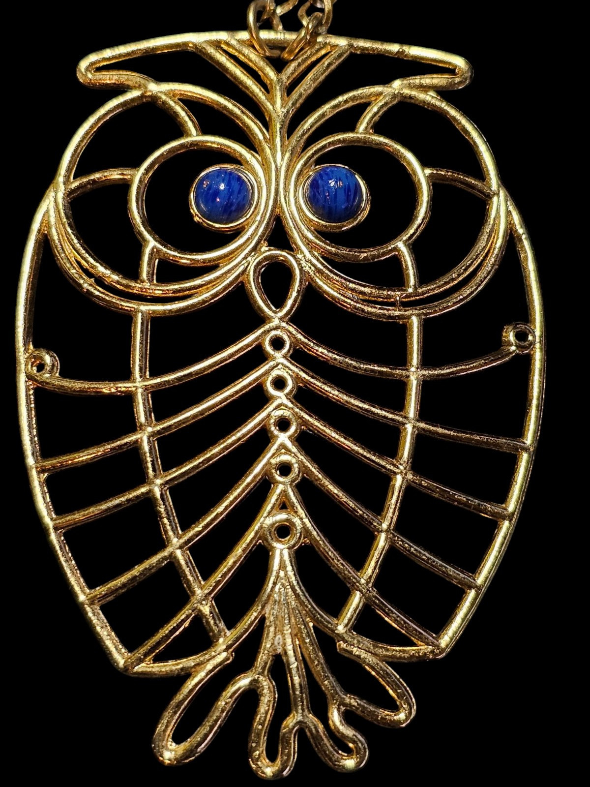 Eyes: The owl?s eyes are two round faux lapis cabochons, giving the piece a striking and vibrant blue contrast against the gold-tone metal.