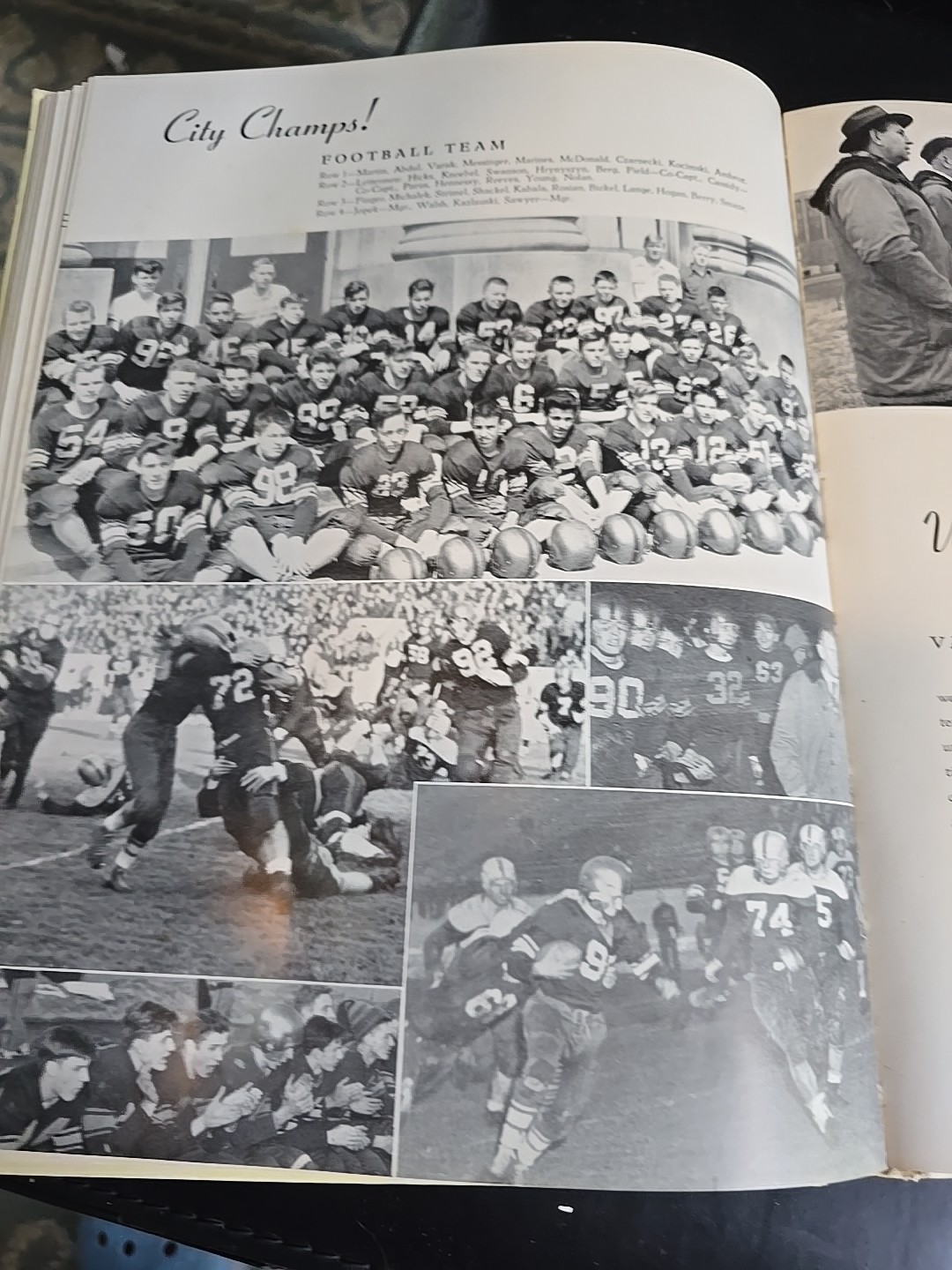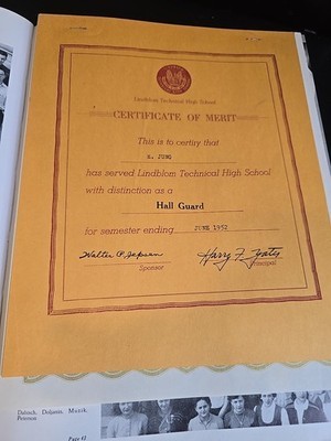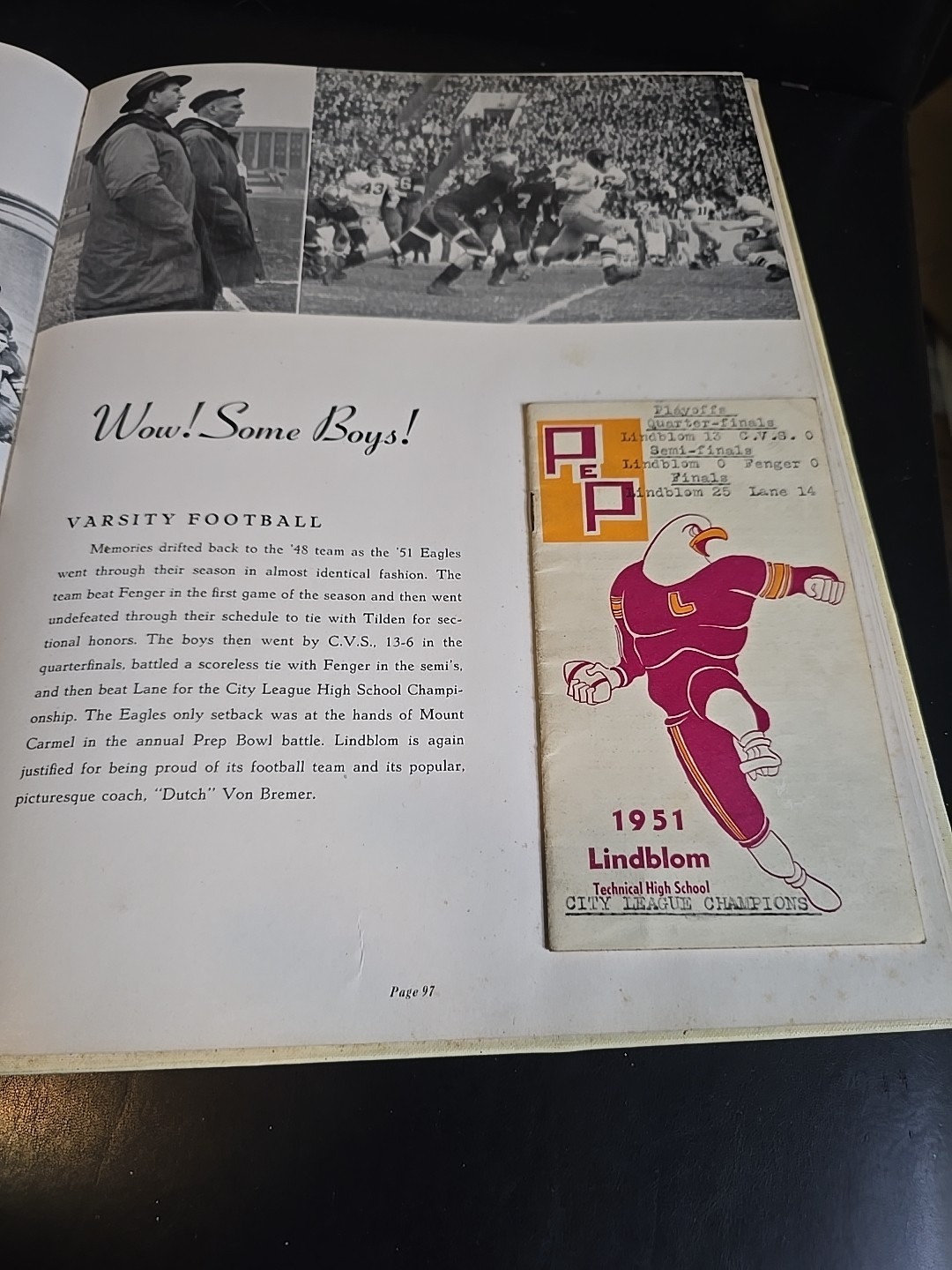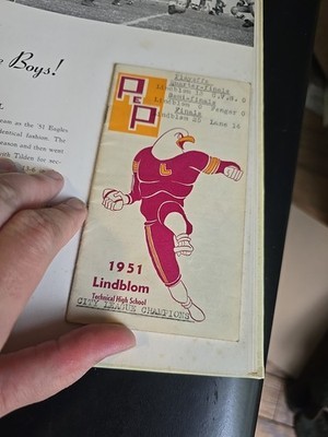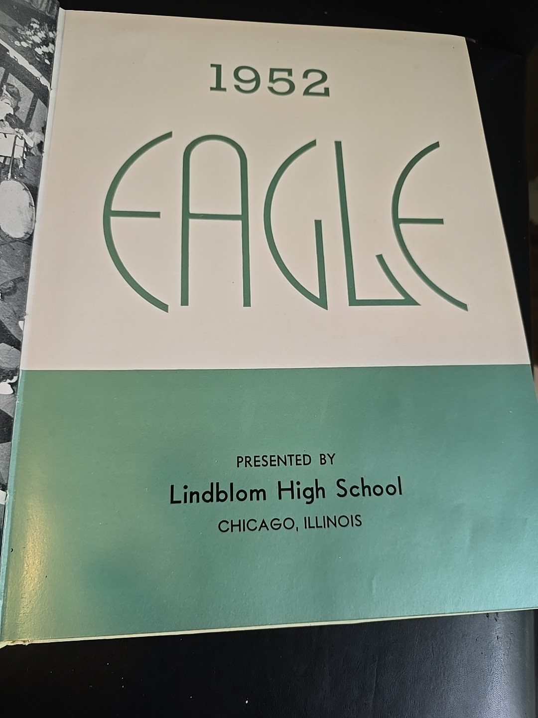 1952 lindblom High school eagle yearbook with their loyalty march music, Hall Guard certificate of Merit, playoffs flyer, and autographs galore. Also has the negatives/proofs of the senior who owned the yearbook but those appear damaged to me.