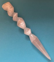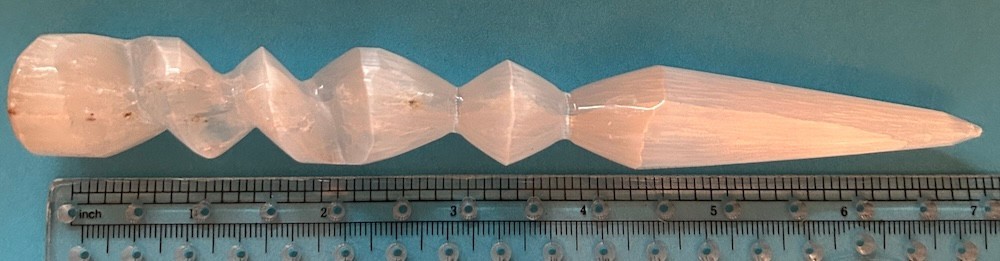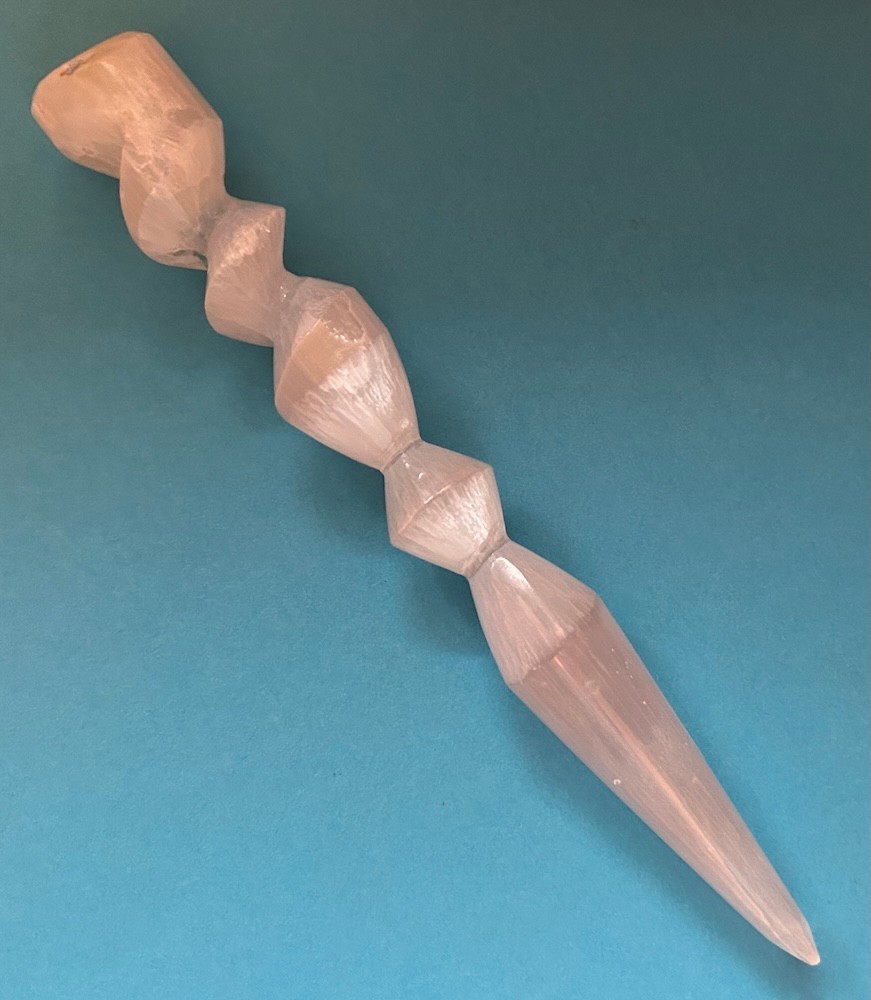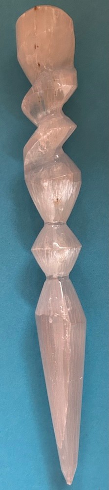 Providing a wonderful magical tool for directing energy within your ritual practice, this selenite spiral wand or athame is a unique piece of art, as beautiful as it is useful within your magical practice. Polished and sculpted piece of selenite, created with unique contours and spiral patterns that fit comfortably to your hand. And once you have it in your hand, you'll not want to put it down. Touched to your palm, you cannot help but to enjoy how easy it would be to channel the flow of energy through your new, selenite crystal wand or athame. Hand carved, about 7 inches in length. Selenite can inherently contain discoloration, fissures and seams - these are not flaws.