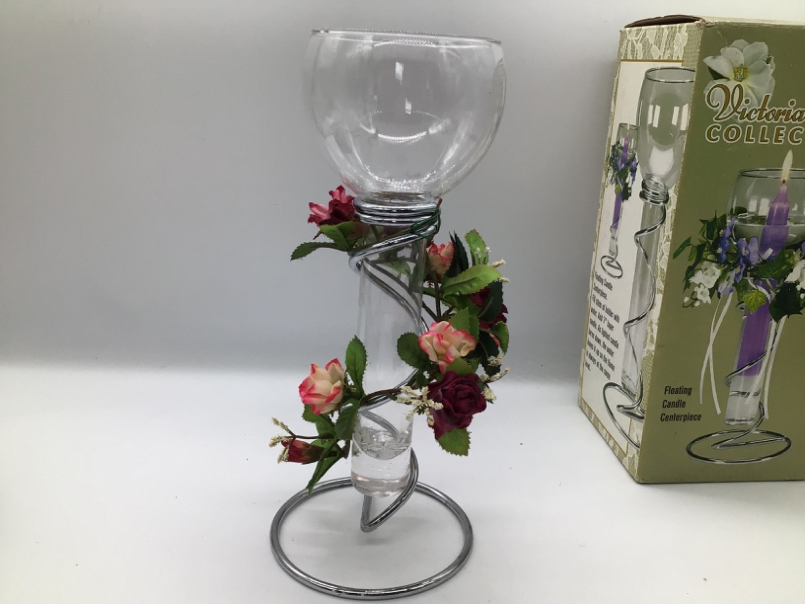 Victoria Lynn Collection Floating Candle Holder with metal stand. Measures approx. 10.25" tall. Features a clear glass taper holder with a spiral silver-tone metal stand. Beautiful piece for table centerpieces, weddings, or home decor.