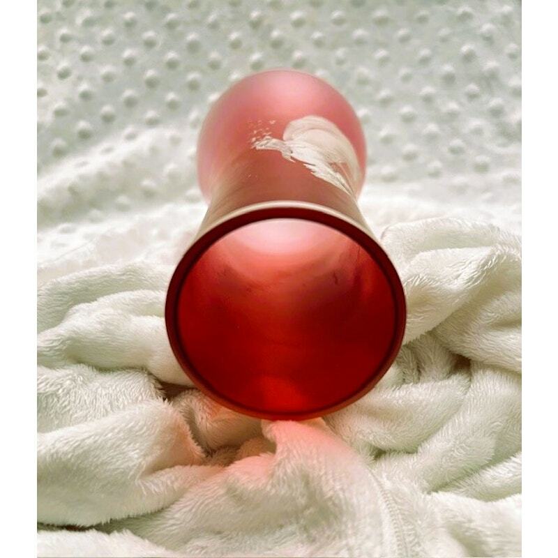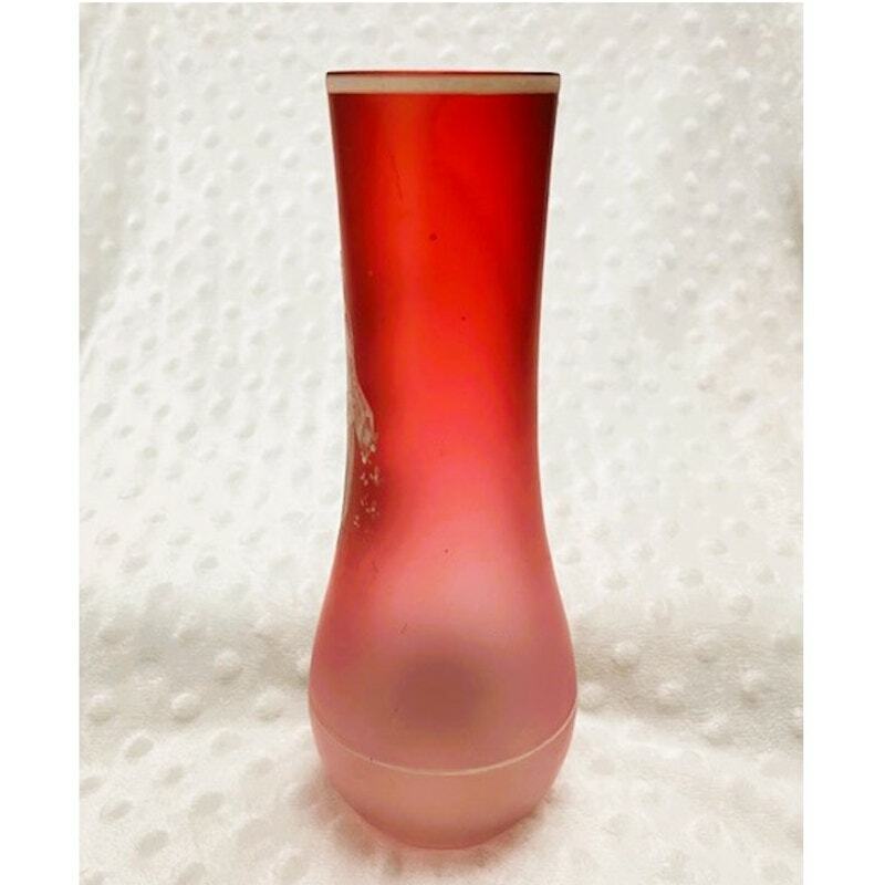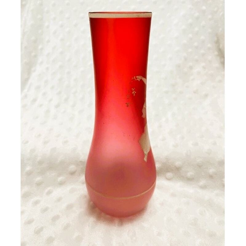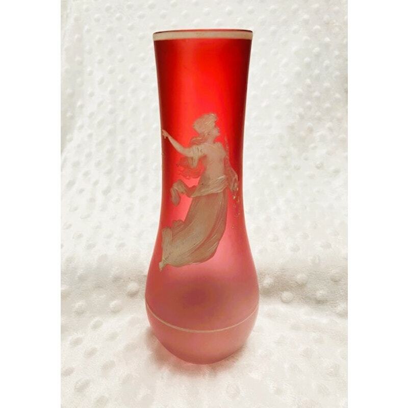 Vintage Fenton Cranberry Ombre Glass, Mary Gregory Cameo Hand Painted Vase 1970s. Beautiful vase features ombre cranberry frosted glass, hand painted flowing woman holding a cornucopia, and falling flowers. tapers to fuller base. Measures 8 5/8" tall, top rim is 2 1/8" across, 3 1/4" across at widest point. Bottom of vase also has handpainted circle. In excellent vintage condition, no cracks, breaks or chips. Bottom contains some small surface imperfections. Comes from a smoke free, pet free home.