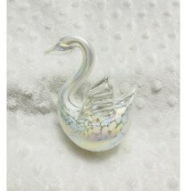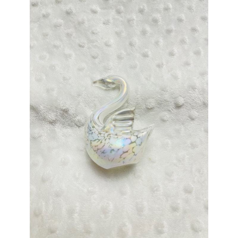 Vintage Viking White Spotted Iridescent Rainbow Lustre Glass Swan. Beautiful swan features white spotted glass, rainbow iridescent lustre, clear iridescent glass wings beak. Bottom is clear glass inside of swan visible. Measures 3 3/4" tall, 2 3/4" long, 2" wide. In excellent vintage like new condition, No cracks, breaks, or chips. Comes from a smoke free, pet free home.