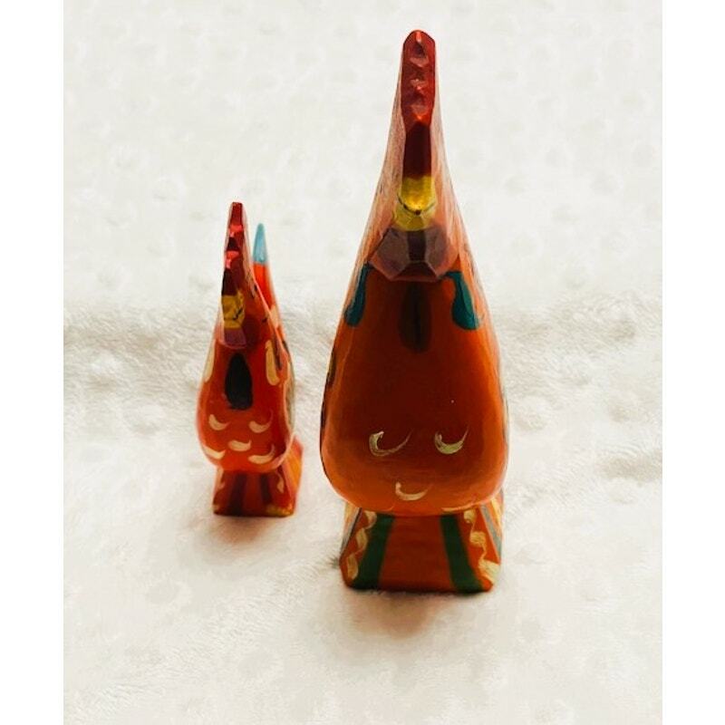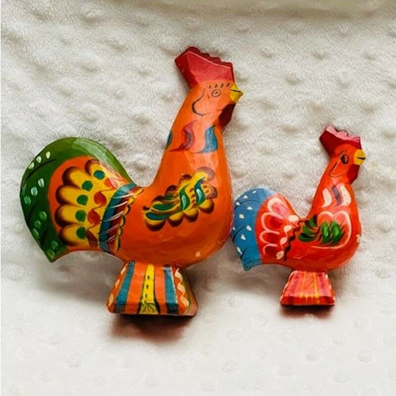 Vintage Rare Swedish Folk Art, Hand-Carved, Hand-Painted Dala Roosters (6.5" 4.5"). Both have an orange background, 4.5" one is a red-orange, 6.5" is traditional orange. Unique roosters are carved from Swedish pine wood and decorated with Kurbits patterns by the artist. Each rooster is unique and no two are exactly alike. Both are in excellent condition with no chips, breaks, or paint chips. Colors are bright vibrant. Comes from a smoke free, pet free home.