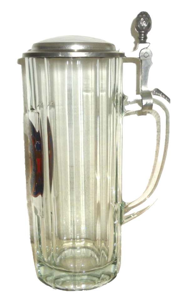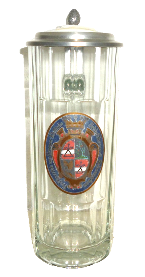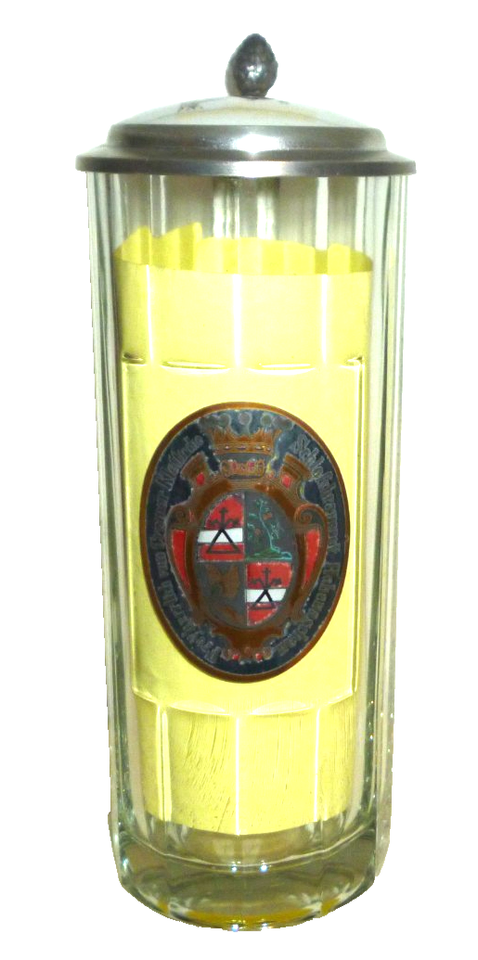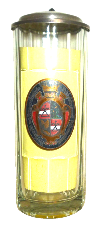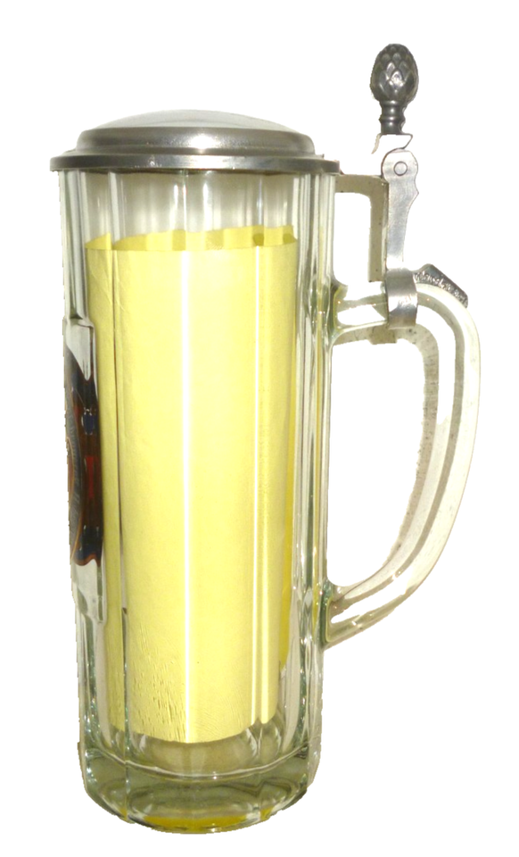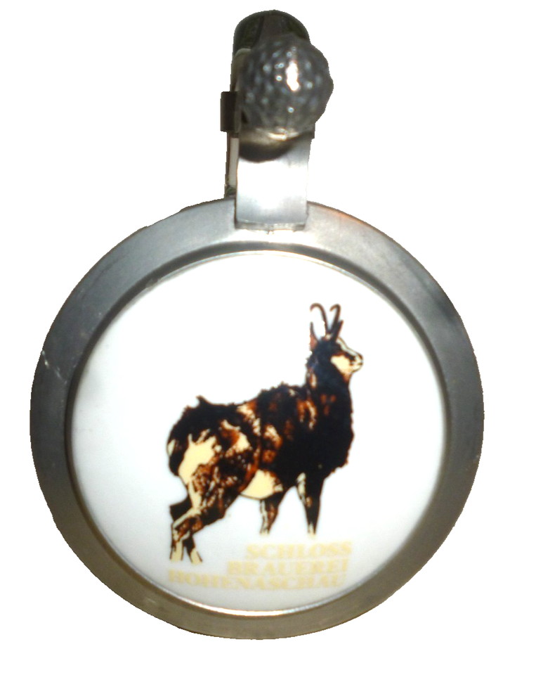 For sale is a wonderfull, vintage, thick-glassed, heavy Hohenaschau enamelled Gams inlay lidded (with Handle on Back) Seidel beerglass with from the Schlossbrauerei (closed, +1991) brewery in Hohenaschau, Germany.