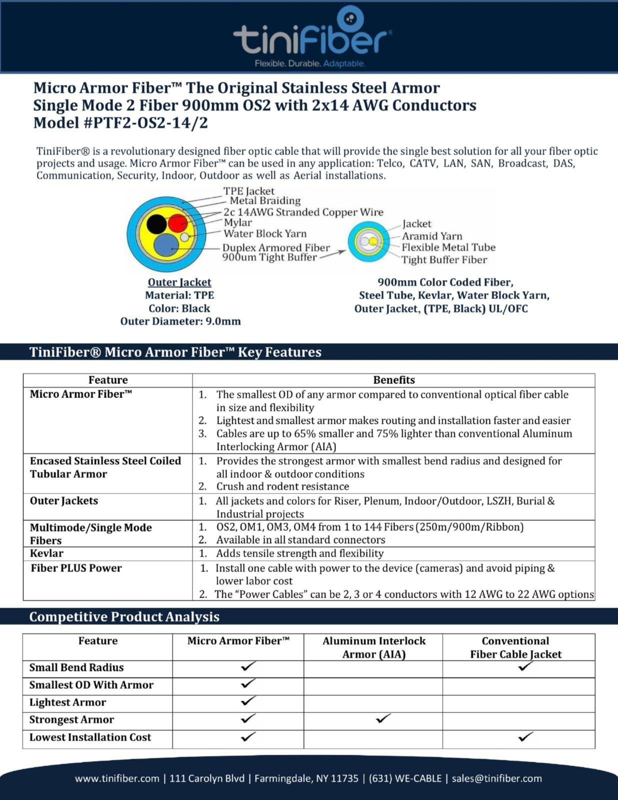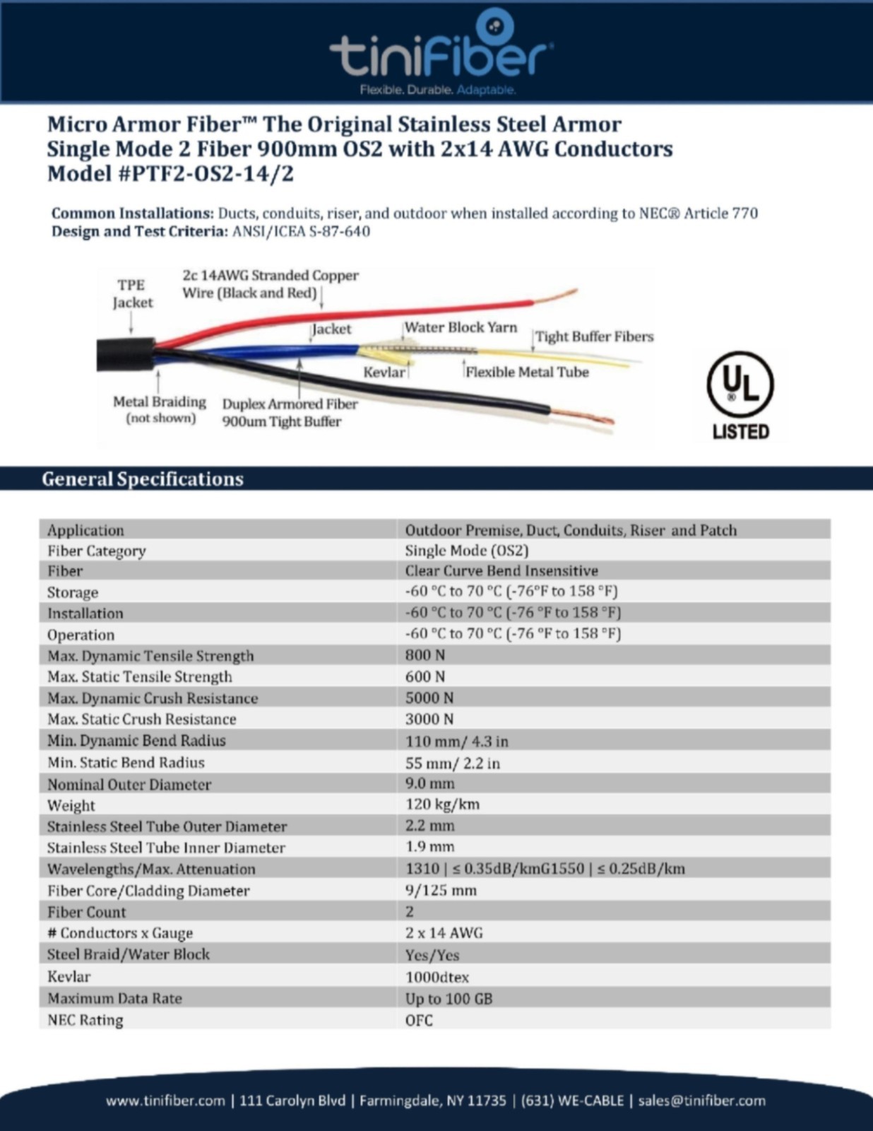 PTF2 Power/TiniFiber 2-Fiber "Power TiniFiber," hybrid cable that combines optical fiber with electrical power conductors. The cable contains 2 optical fibers.