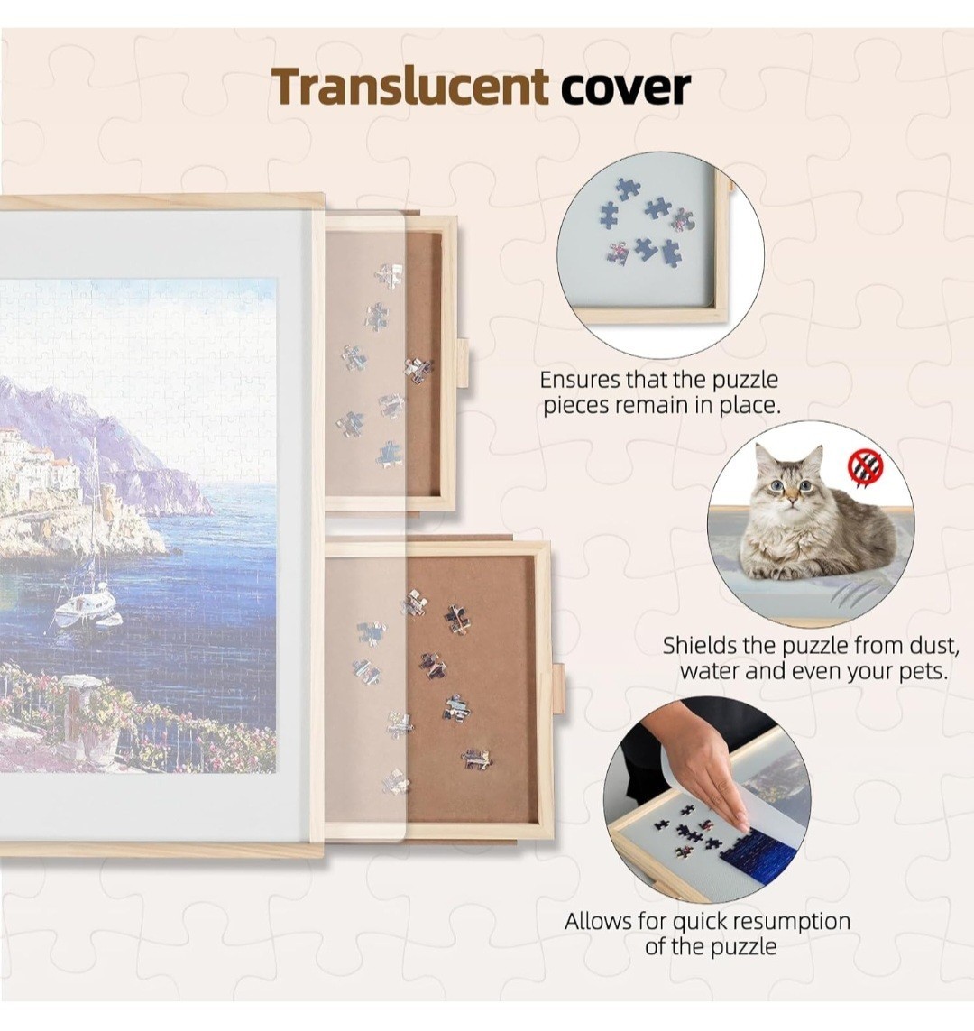 Organize with Ease: Say goodbye to the chaos of scattered pieces! A protective translucent cover protects puzzle pieces from spills,dust and dirt even your little naughty pets. With four strategically designed sorting drawers, they can be used as puzzle trays to sort and protect. When not being used for puzzles, puzzle sorting table can serve as writing desks, a game night table, drawing boards, or even as trays for holding snacks during movie nights.