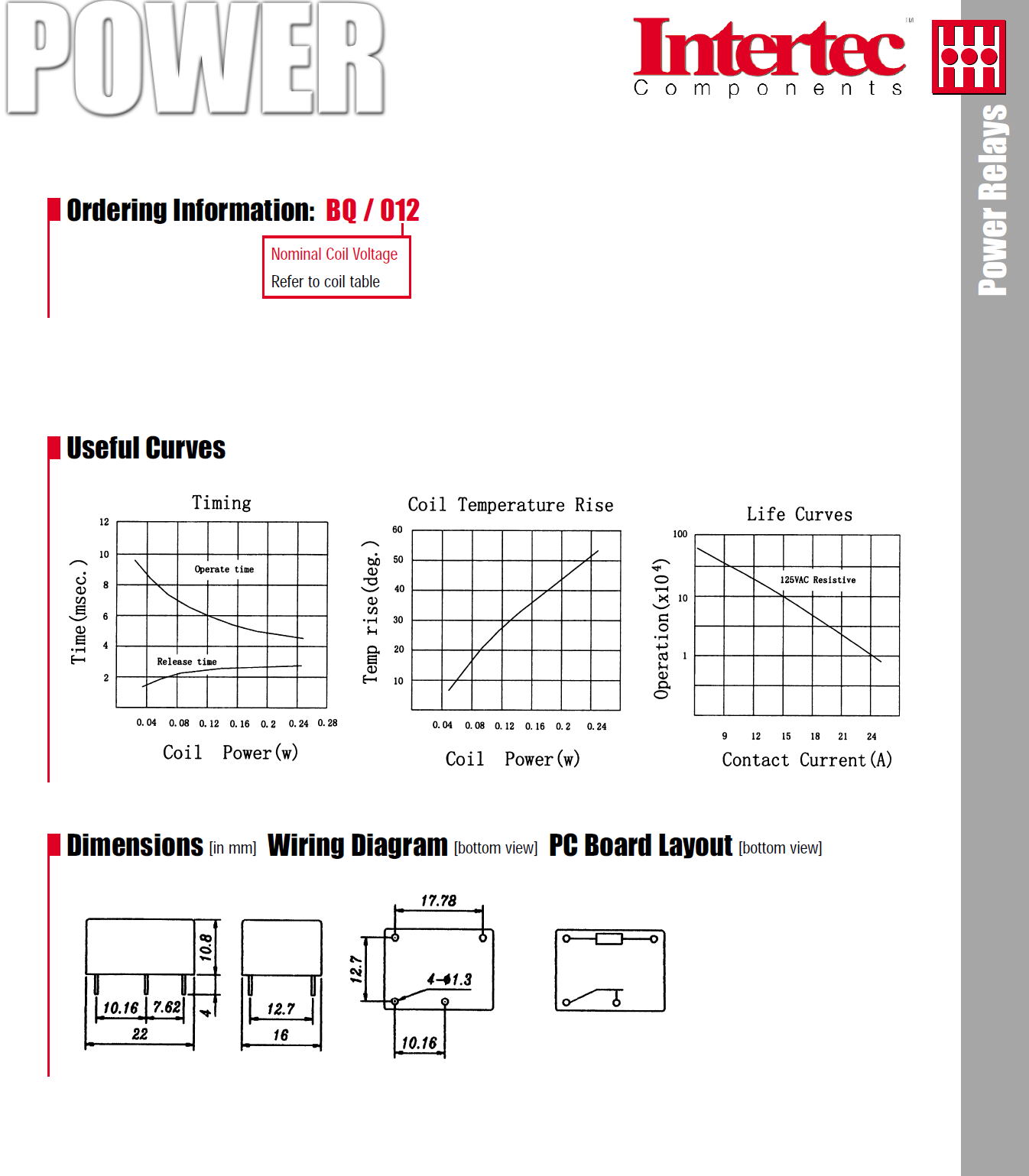 BQ-12 Intertec Power Relay 12VDC SPST-NO 1FormA 15A 250VAC Sealed 4-Pin