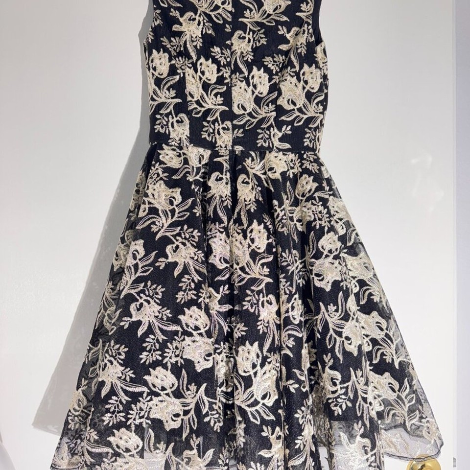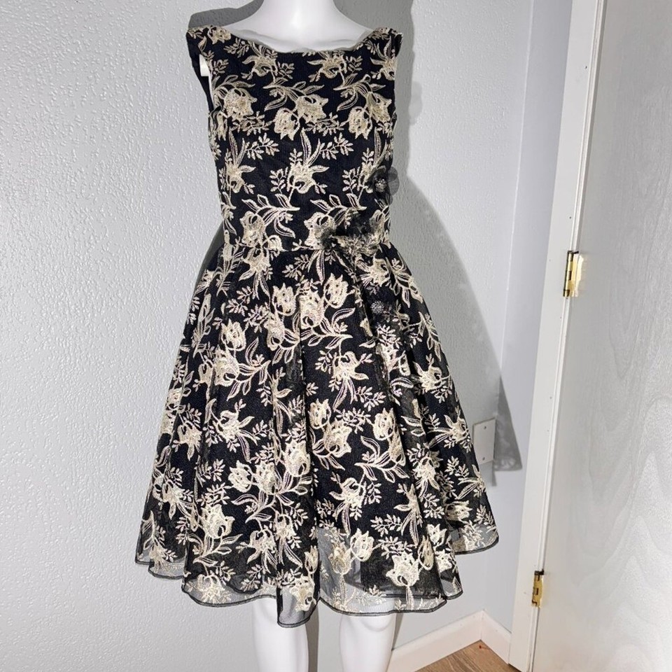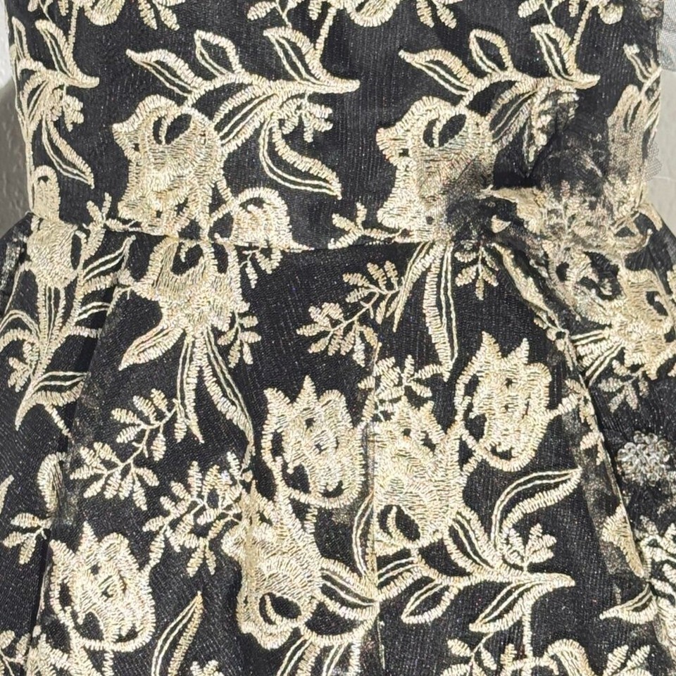 A luxurious special occasion dress by David Charles Gold Label, featuring a black mesh overlay adorned with gold floral embroidery. This sleeveless fit-and-flare style has a structured bodice, full skirt, and elegant floral waist embellishment?perfect for weddings, parties, or holiday events. High-end quality, made in the UK, and known for timeless sophistication. Excellent condition.