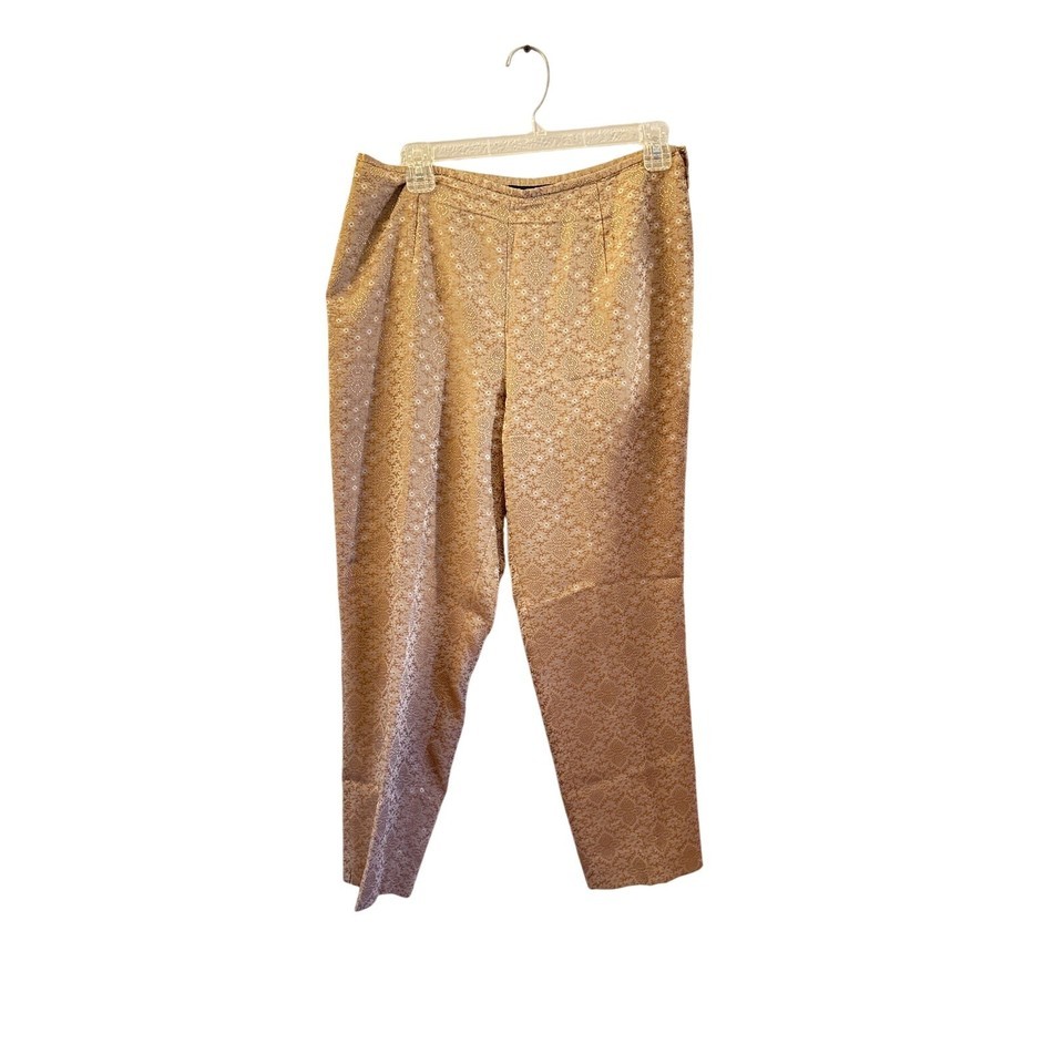 Elegant Ann Taylor Petites pants in size 10, made in Malaysia. These trousers feature a sophisticated gold-brown tone with an allover design pattern. Crafted from a smooth blend of 75% acetate and 25% polyester, fully lined with 100% acetate for a comfortable fit and polished finish.