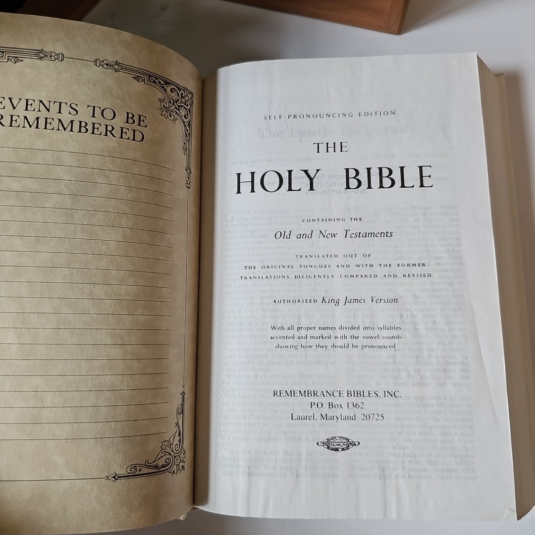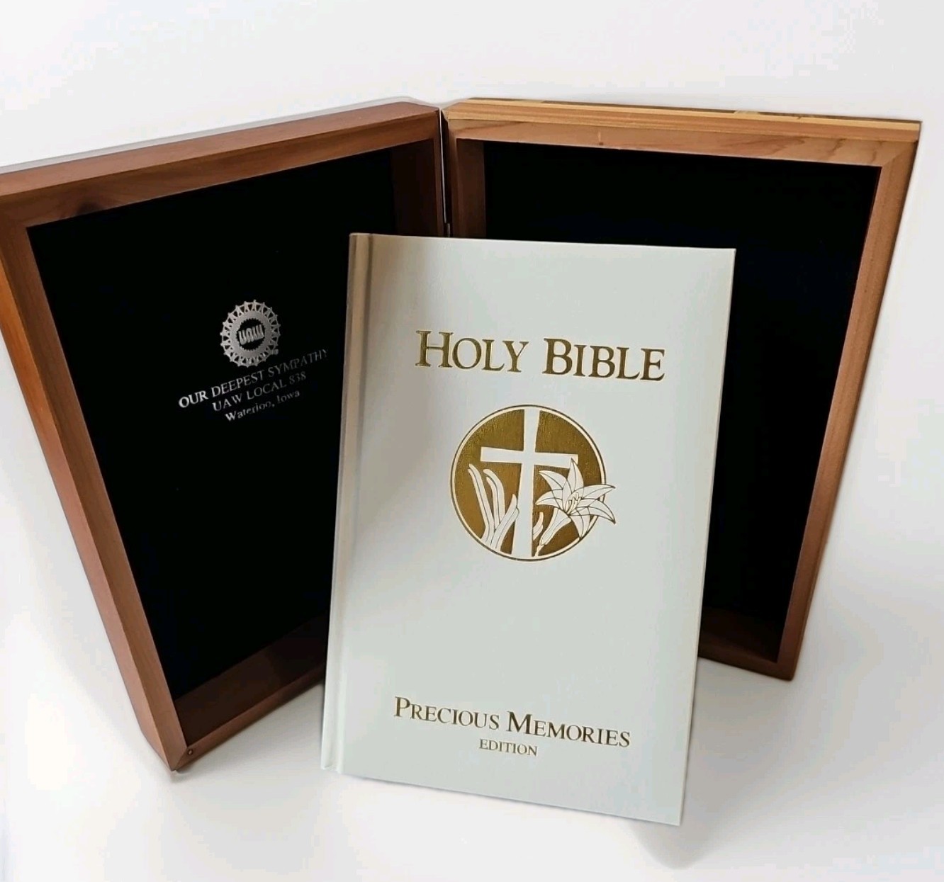 PRECIOUS MEMORIES Holy Bible King James Version Wooden Box Case and bible.
