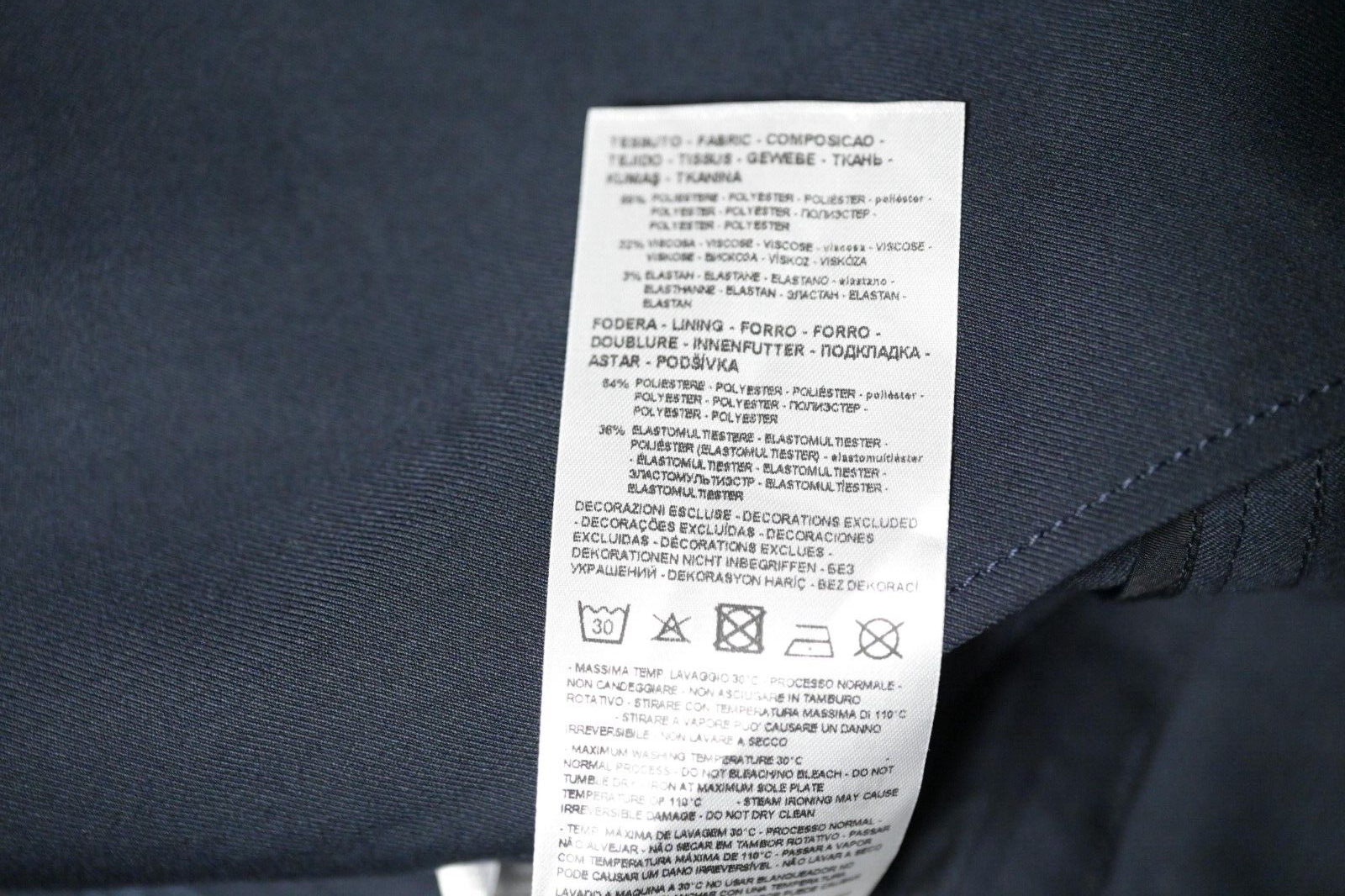 Shell: 65% Polyester; 32% Viscose; 3% Elastane. Lining: 64% Polyester, 36% Elastomultiester