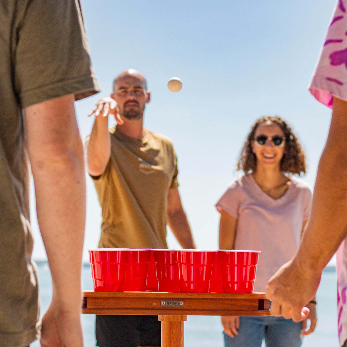 The Captain Social Pong is a portable cup pong game with an adjustable height stand designed for standing or seated play. Its mahogany finish gives it a classic, stylish look that will fit well in any setting. This game is perfect for parties, weddings, tailgating, or any other social gathering.