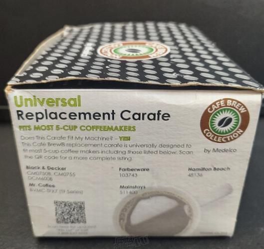Cafe Brew Collection Universal Replacement Carafe 5Cups BPA-Free Duran. Universal Replacement Carafe FITS MOST 5-CUP COFFEEMAKERS This Cafe Brew? replacement carafe is universally designed to fit most 5-cup coffee makers including those listed below. Black Decker CM0750B, CM0755 DCM600B Mr. Coffee BVMC-TFX7 (TF Series) Farberware 103743 Mainstays 511400 Hamilton Beach 48136