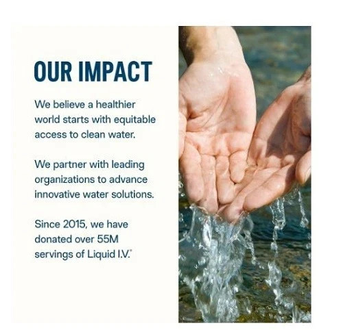 HYDRATION AID: Since 2015, we have donated over 55 million servings of Liquid I.V. to those in need around the globe, and donate over 1% of our revenue to our Impact programs.