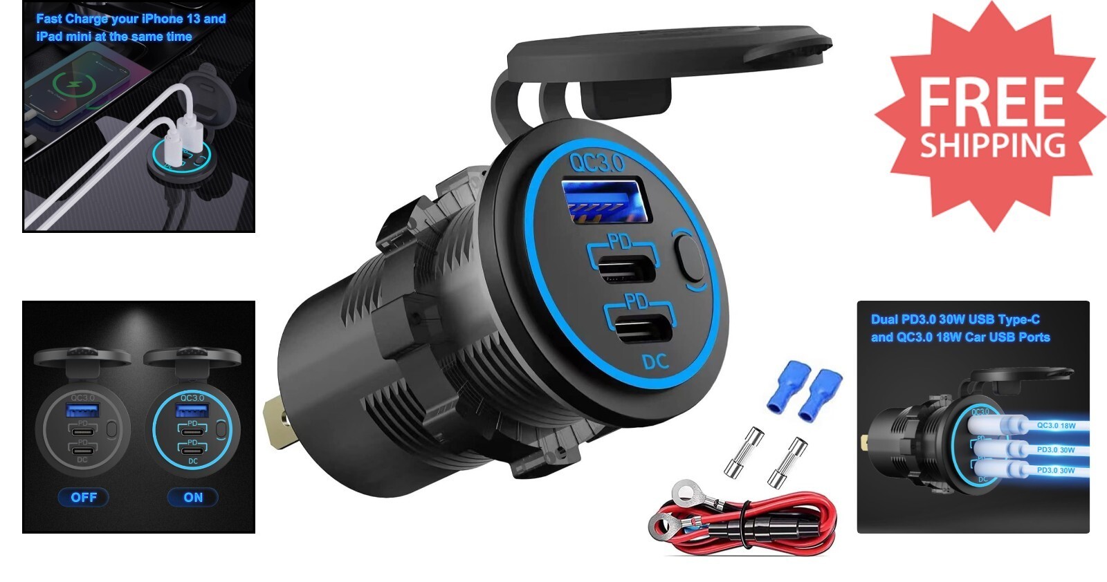 Upgrade your vehicle's charging capabilities with the Hapytrip 3-Port 12V USB Outlet. Equipped with an intelligent chip, it provides fast, efficient charging for multiple devices simultaneously. Features dual PD3.0 USB-C ports for rapid power delivery to iPhones, iPads, and more, alongside Quick Charge 3.0 technology for up to four times faster charging speeds. The blue LED indicator and convenient switch make it easy to locate ports in darkness and conserve vehicle battery when not in use. Versatile and easy to install, suitable for cars, trucks, boats, and RVs; note that the PD ports do not support laptops. Optimize your travel experience with this reliable, high-performance USB outlet.