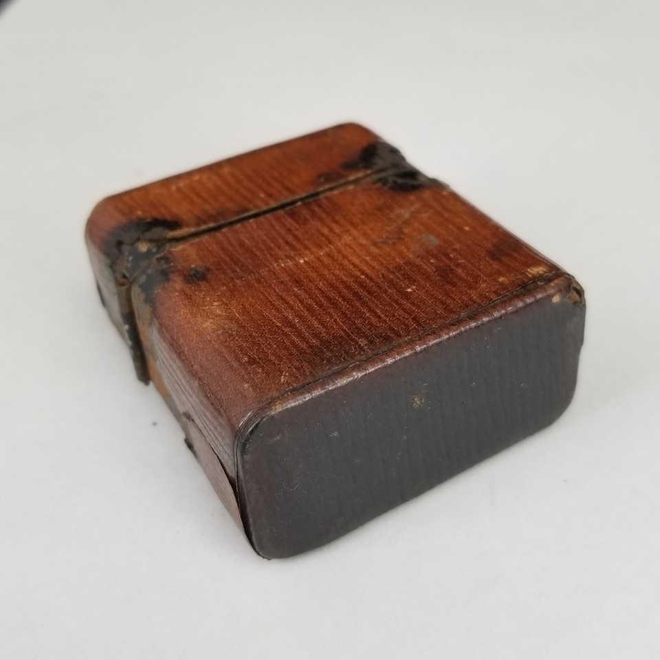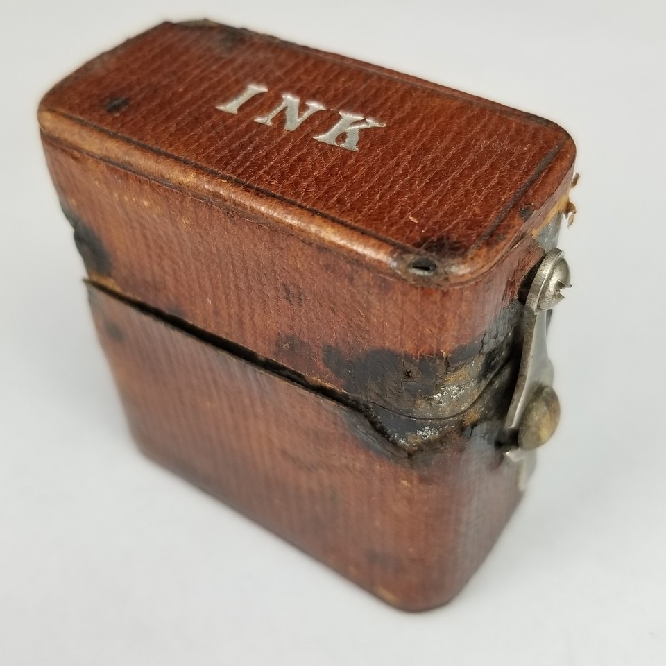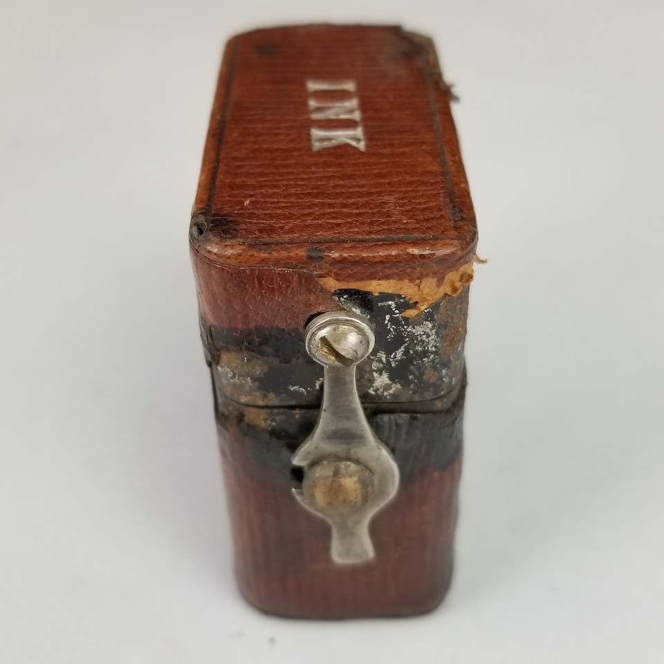 Antique traveling portable ink well. Glass container inside a leather wrapped case. Latch along with "INK" print on the top.