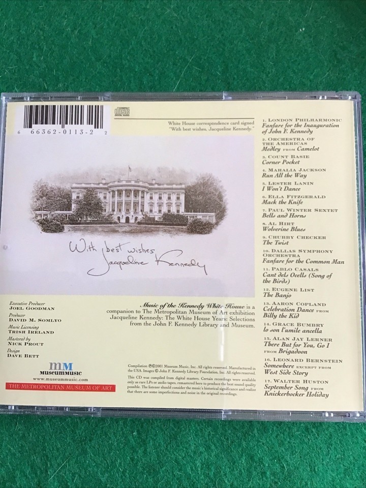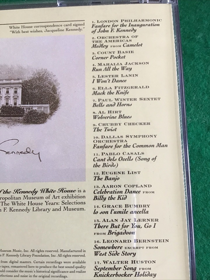 The CD is presented in white and features performances by the Orchestra of the Americas, Count Basie, Chubby Checker, London Philharmonic, Paul Winter Sextet, and other artists. The album title, "Music of the Kennedy White House," suggests a compilation of music that was performed during the Kennedy administration. This CD is a great addition to any music lover's collection.