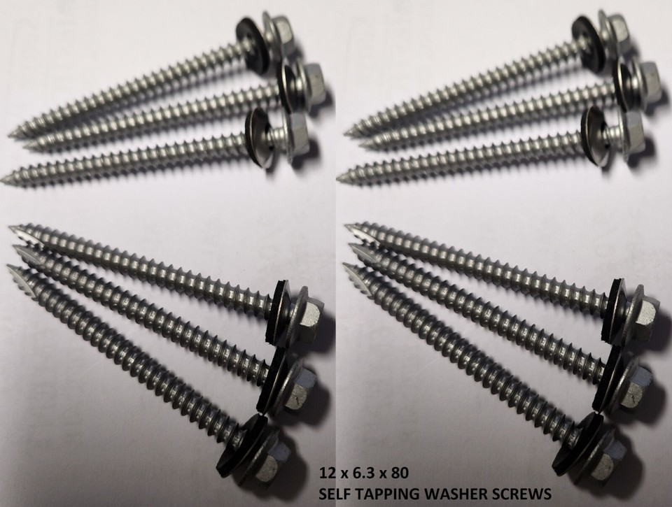12 x High Quality Screws 6.3mm x 80mm self Drilling Tek Screws to fit into Composite panels or timber section with built in19mm Bonded Washers to make it waterproof