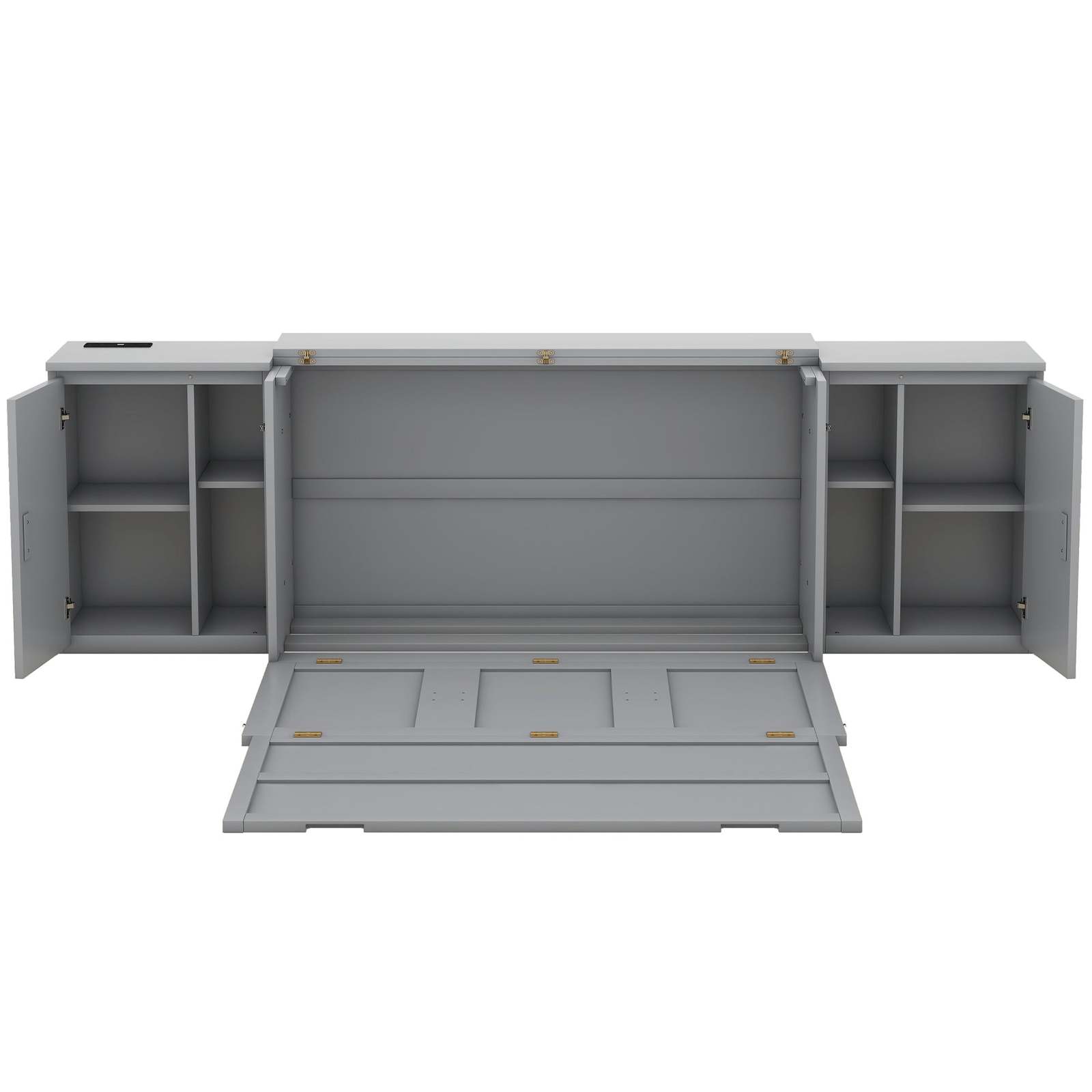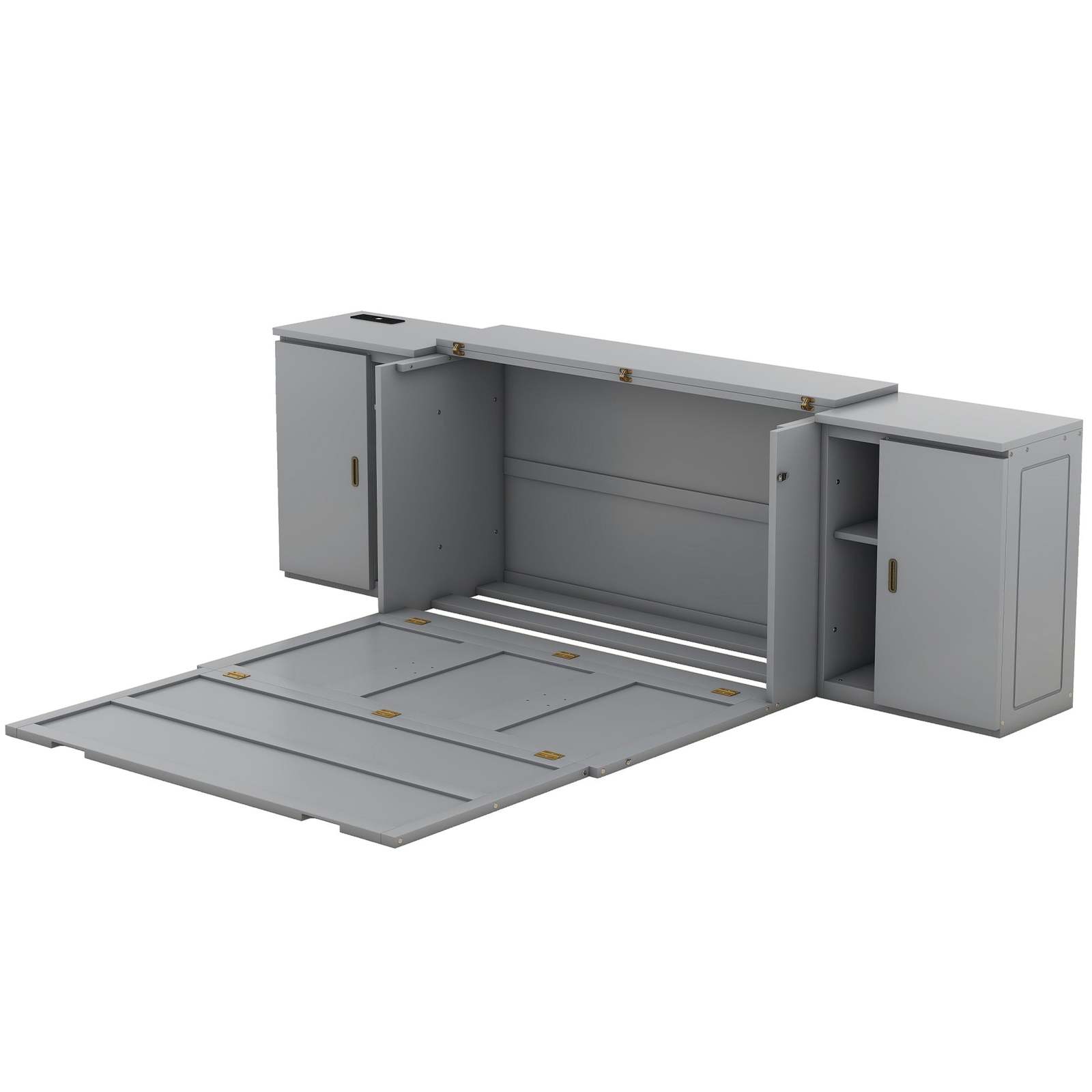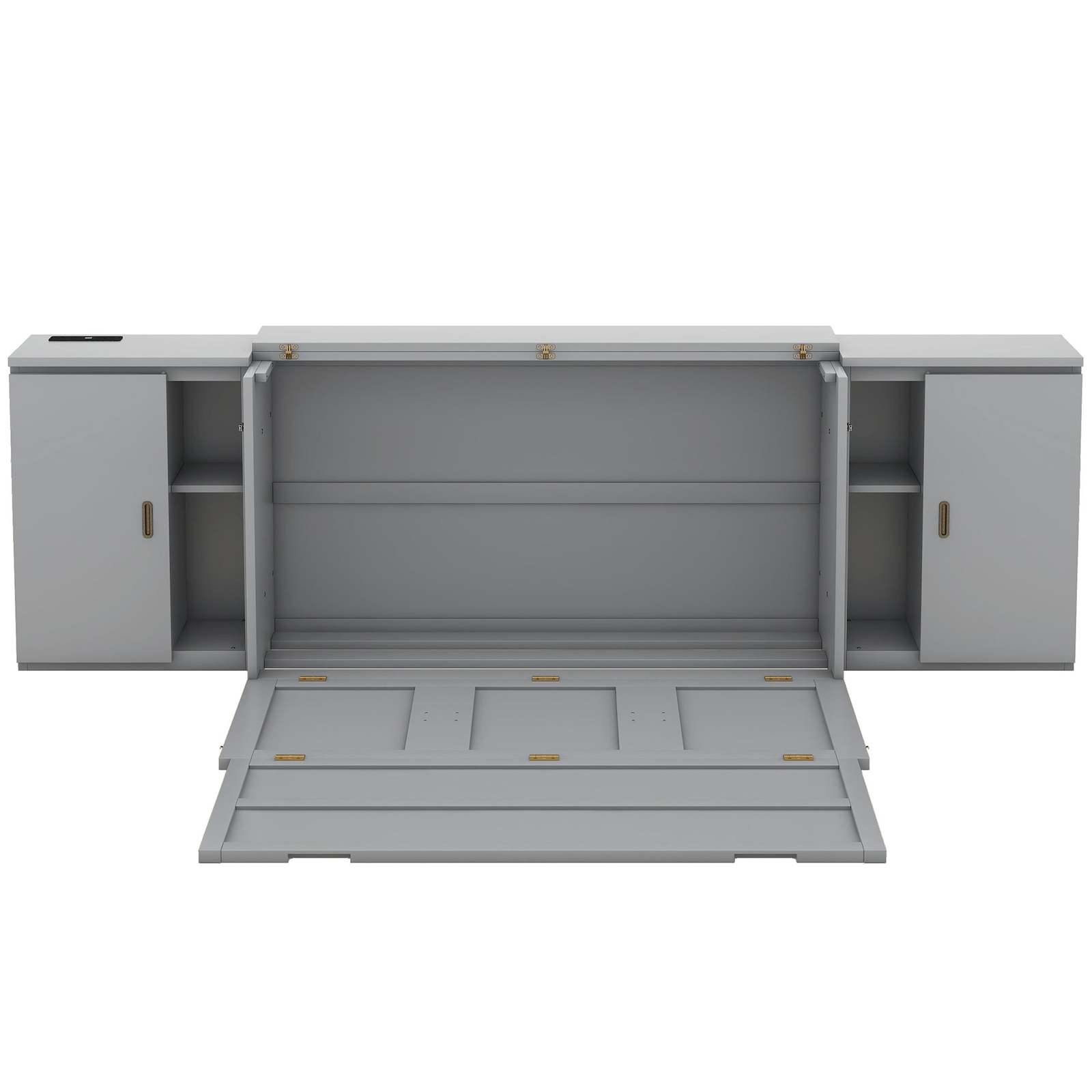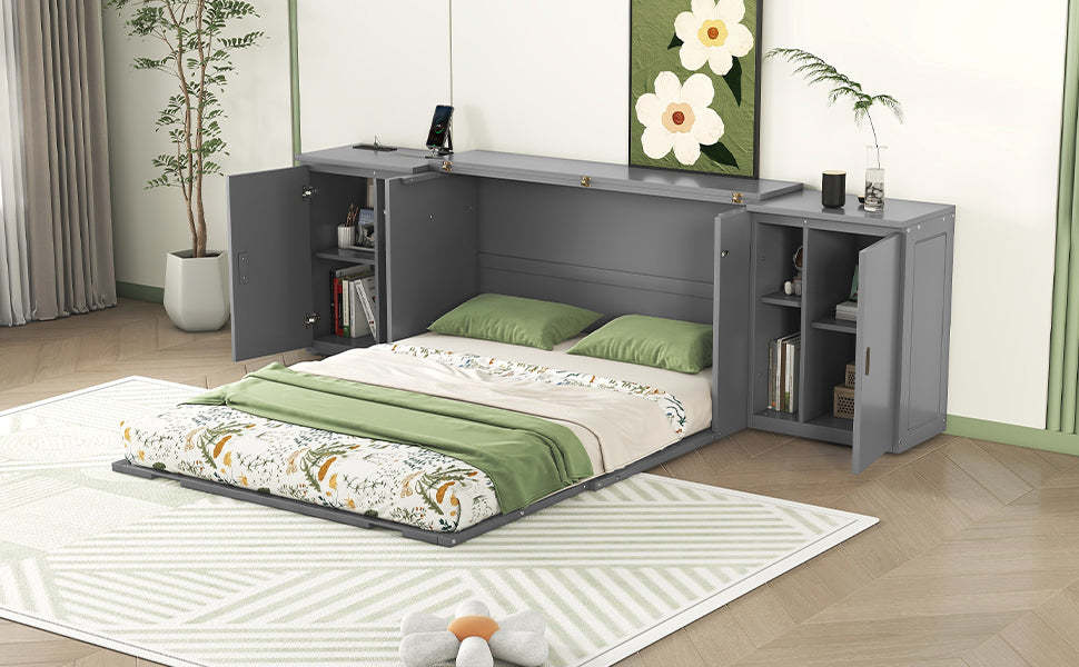Queen Size Murphy Bed with Shelves, Cabinets, USB Ports - Gray