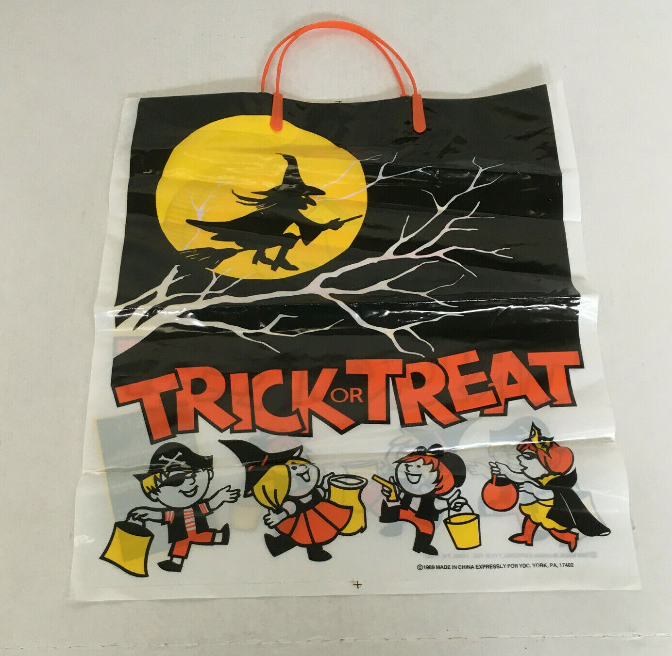 Vintage 1989 plastic trick or treat bag with handle graphics witch pumpkin