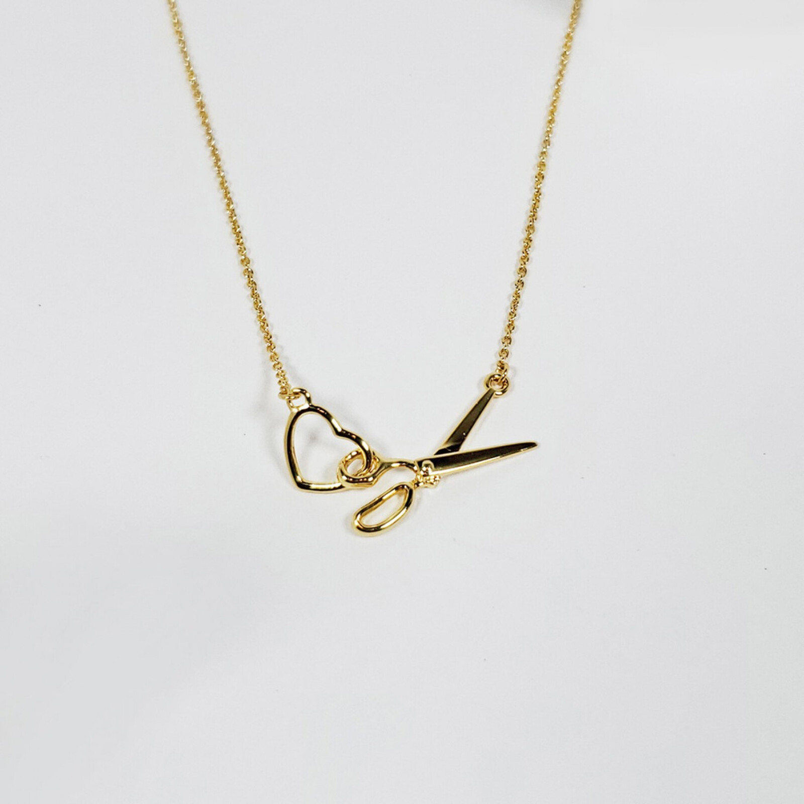 This adorable charm necklace features the scissors interlocking with the open heart charm.
