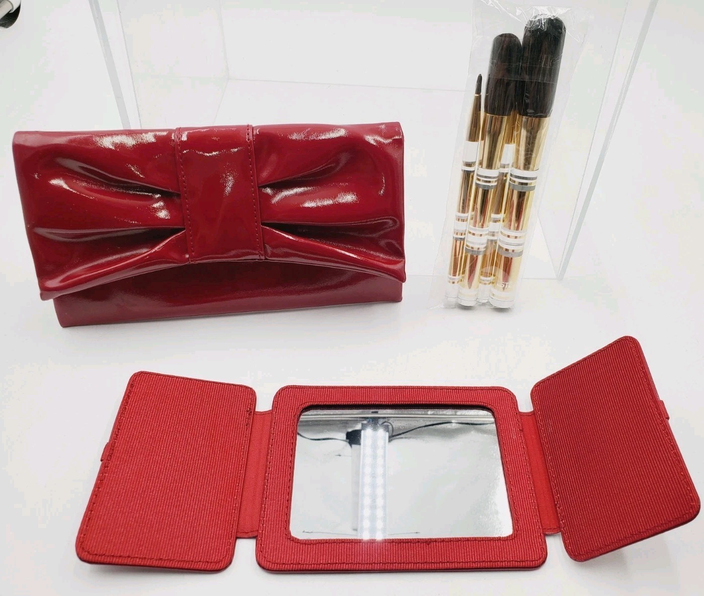 New Estee Lauder Makeup Brush Travel Bag Mirror Set Two Tone Gold Clear