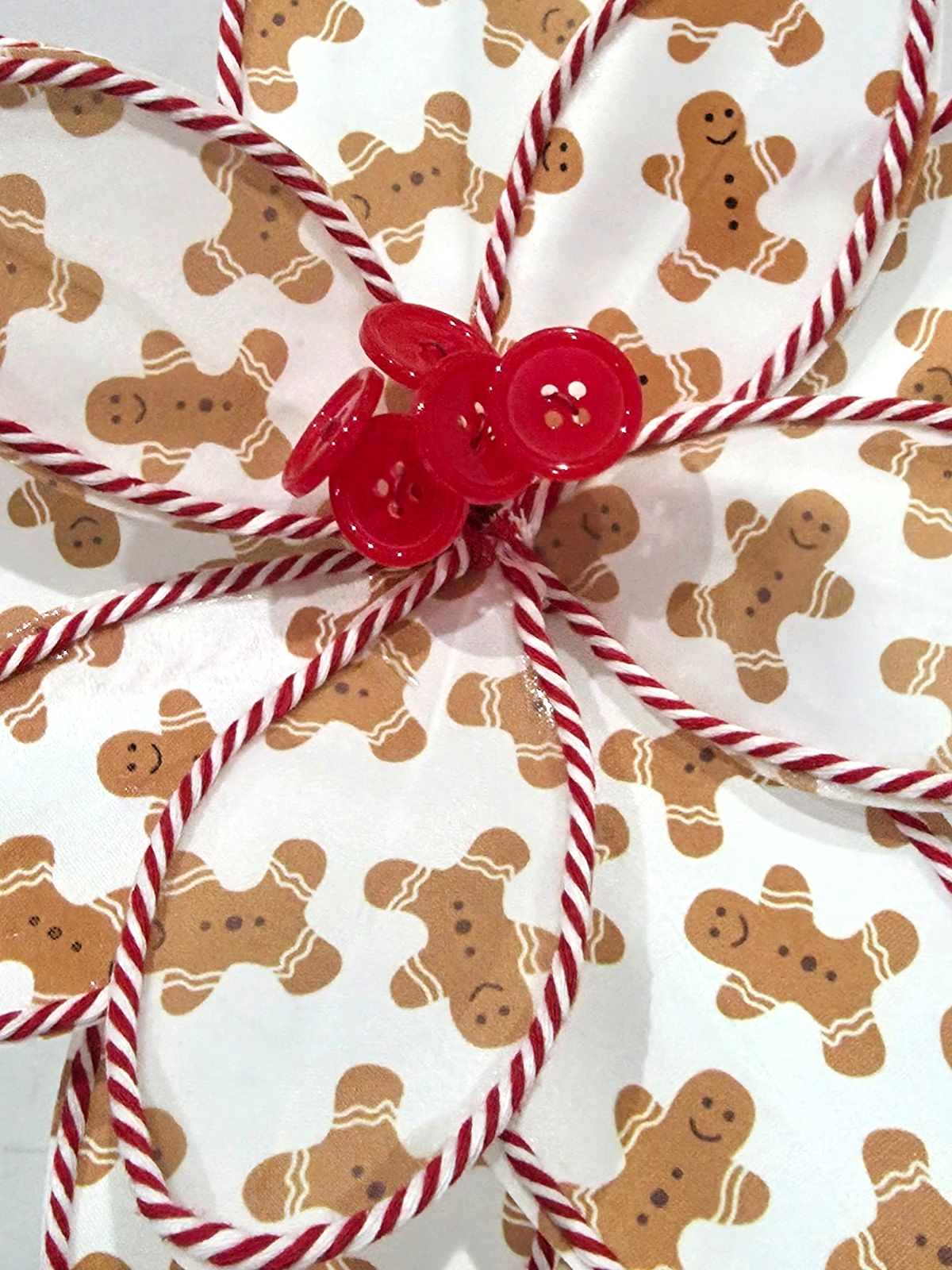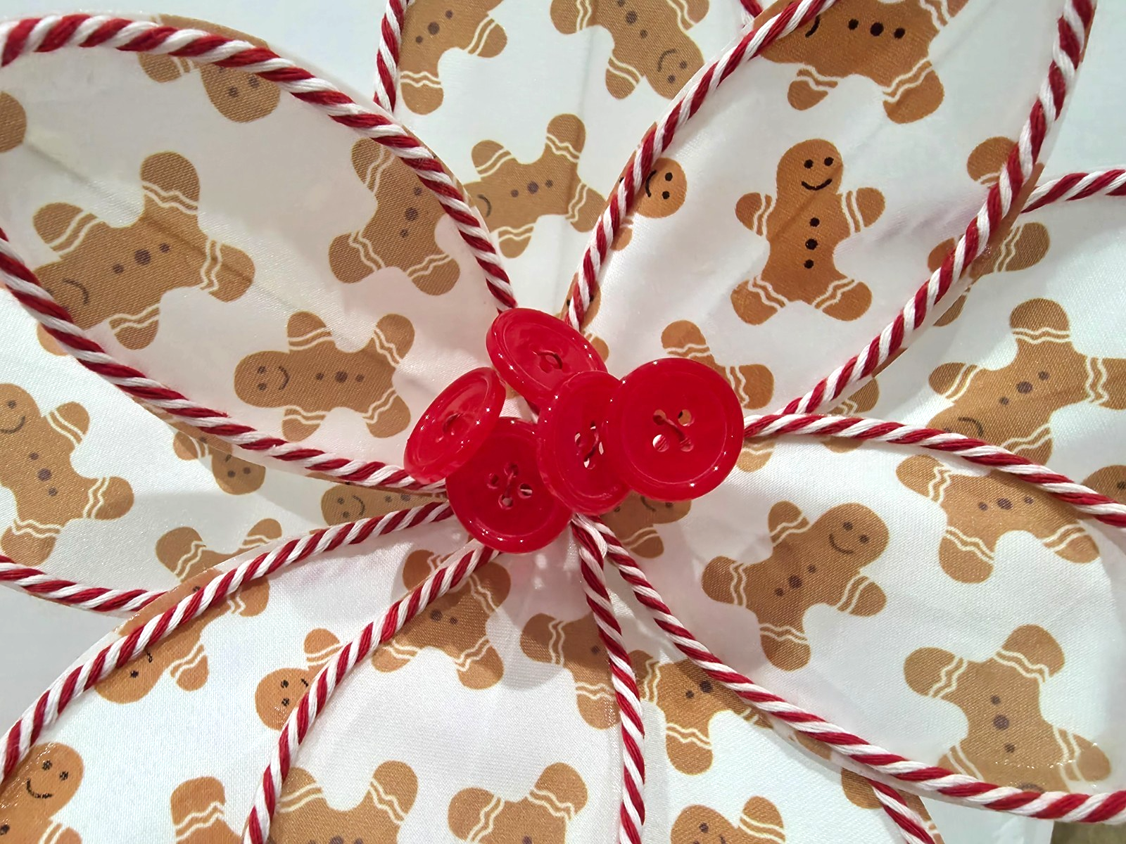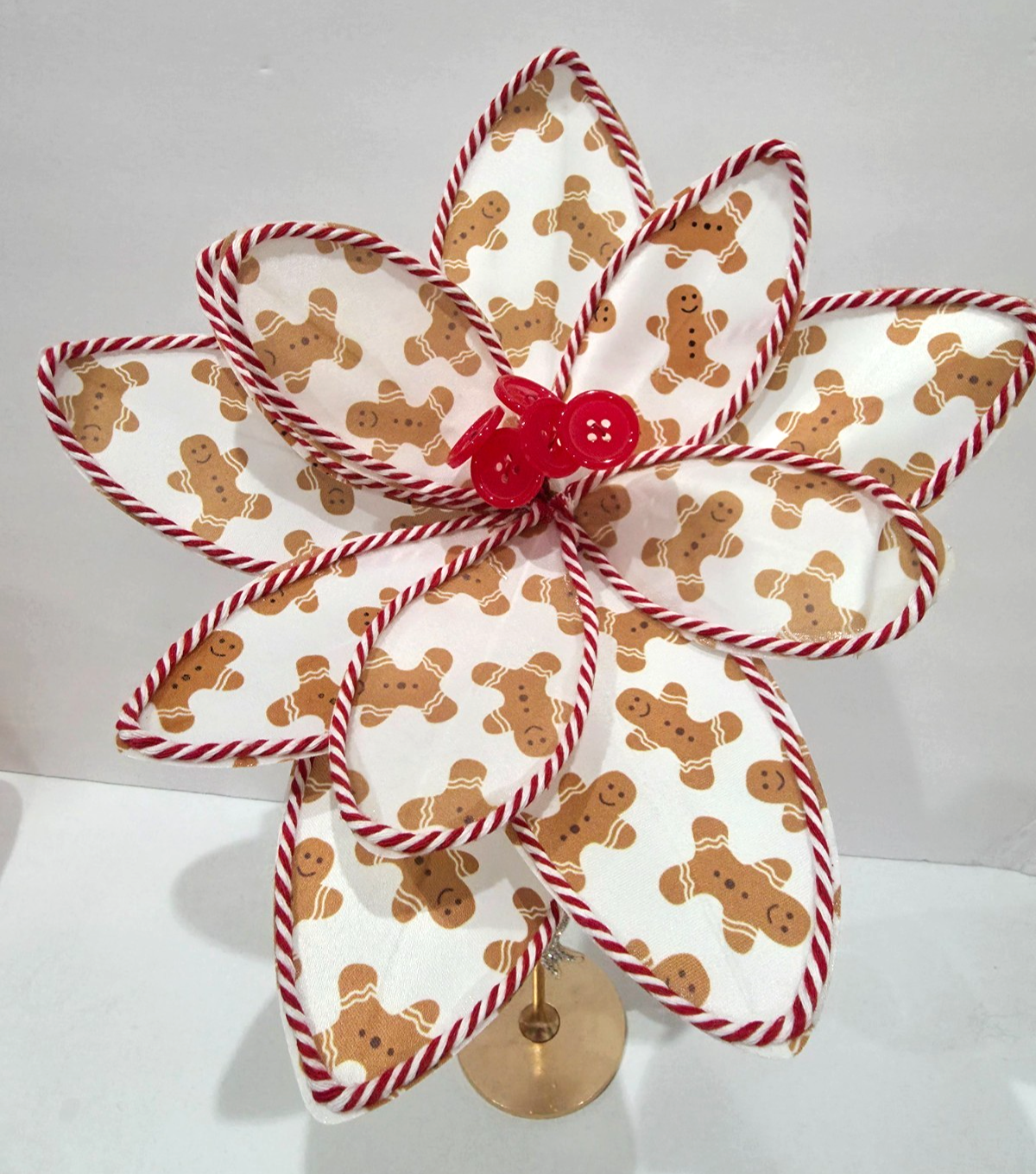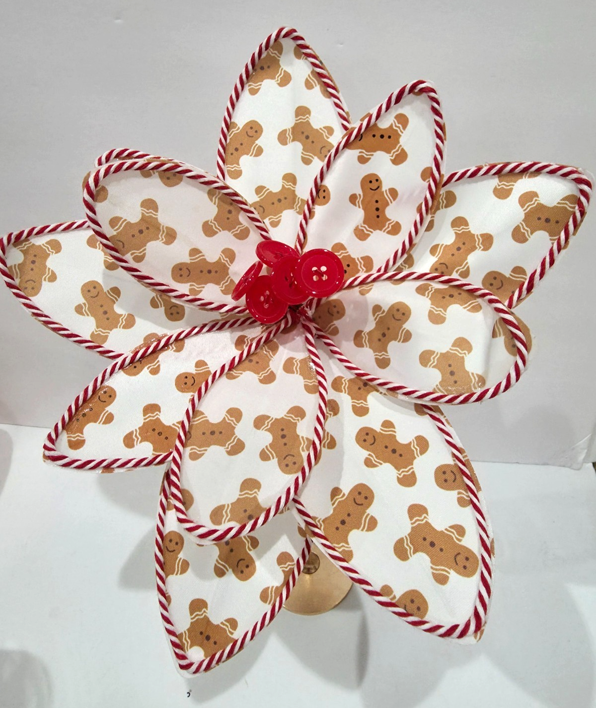 Up for sale we have (1) GORGEOUS gingerbread poinsettia pick that would look amazing on your tree or wreath decor. The poinsettia has brown gingerbreads and the center has cute red buttons. The pick measures approx 10" wide in the picture shown (width depends on how you spread them out). These are new.