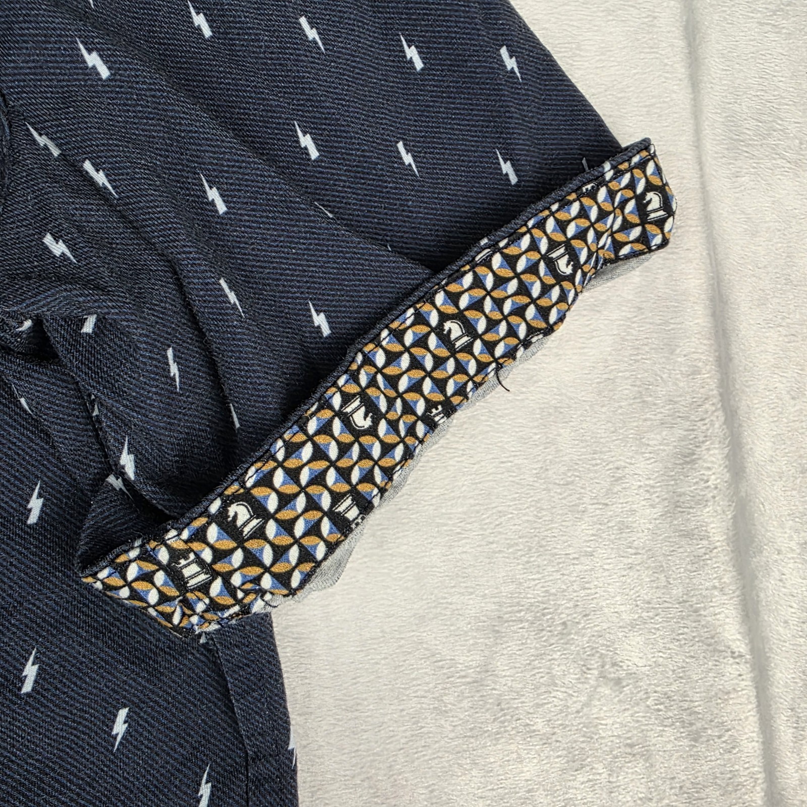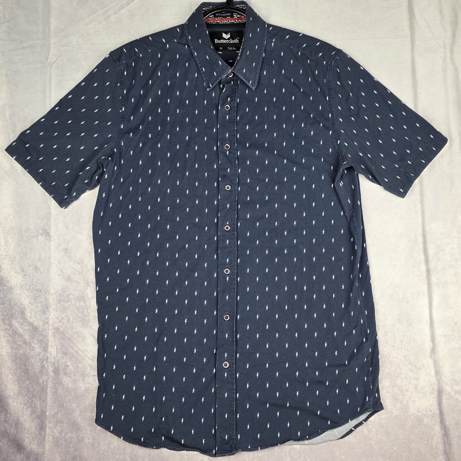 The Buttercloth Shirt is a men's medium tall fit button-up shirt in a blue geometric pattern with a lightning bolt design. Made from a blend of spandex and cotton, the shirt features a collared neckline and short sleeves, making it suitable for various occasions including travel, casual outings, formal events, and business meetings. The shirt is machine washable, lightweight, breathable, and moisture-wicking, ensuring comfort throughout all seasons. Designed with a regular fit and a point collar, this classic and preppy shirt from Buttercloth is a stylish addition to any man's wardrobe.