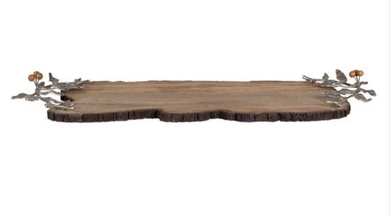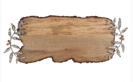 This Woodgrove Serving Board by Fitz and Floyd is perfect for serving cheese arrangements, sliced fruit, appetizers, small desserts, and so much more. The lustrous leaf details embellished with delicate, wooden beads add an elegant yet rustic look to your table. The convenient, built-in handles make it easy to carry the board from the kitchen to the table. Handcrafted from mango wood and antique brass with a nickel finish for long-lasting beauty.